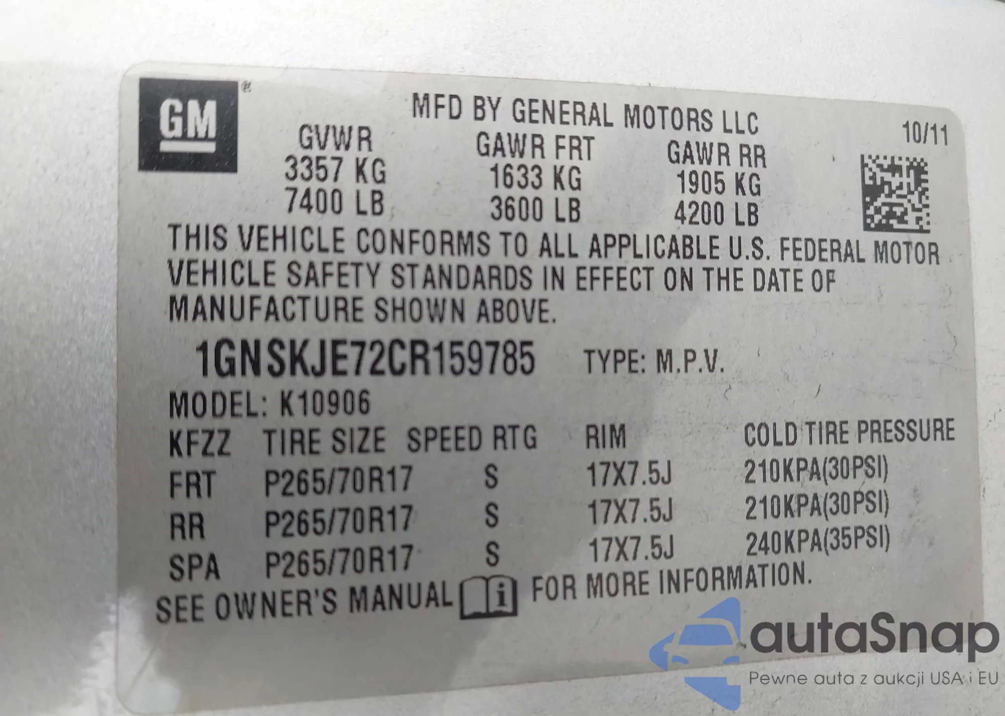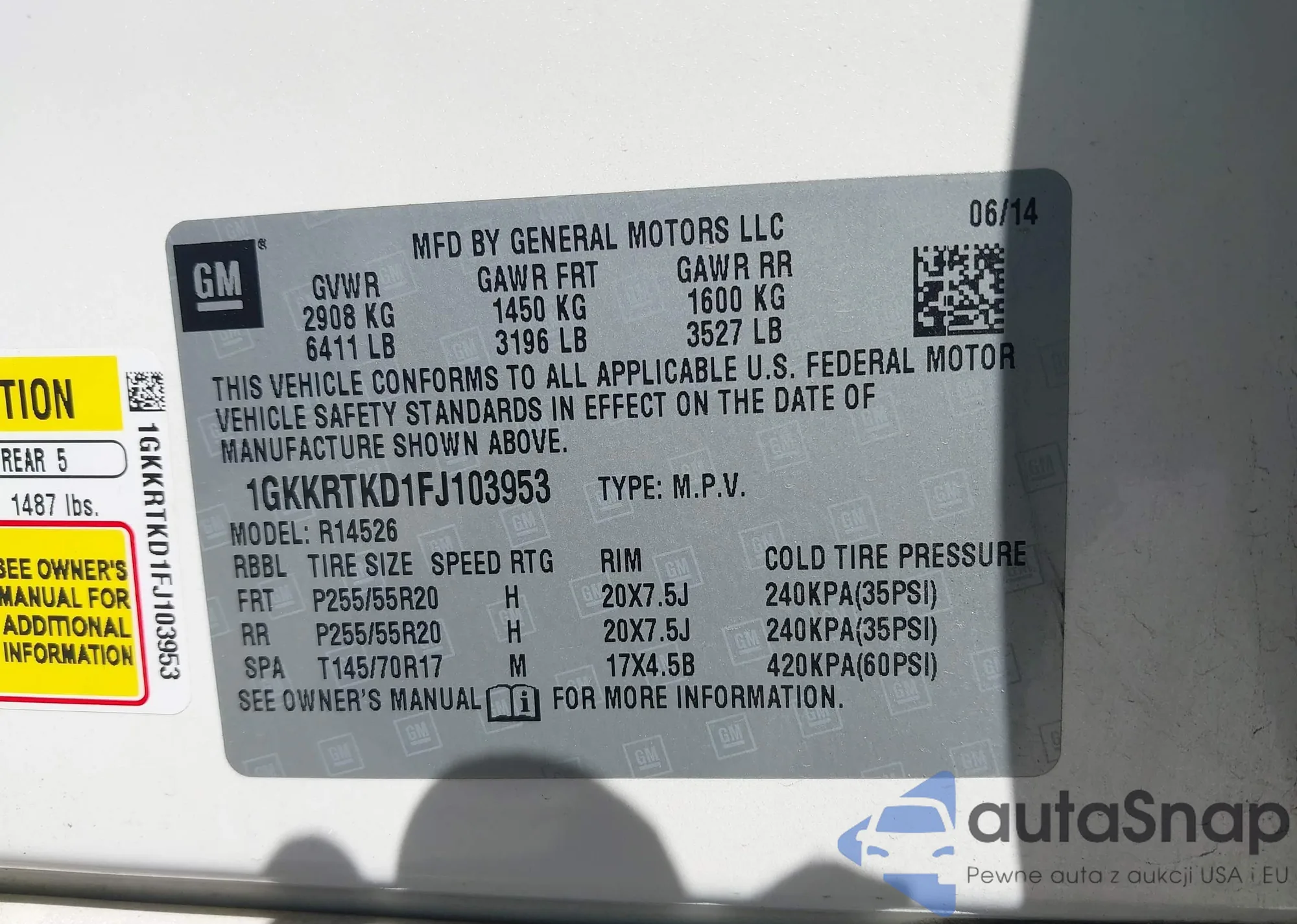 LOT: 41872073 VIN: 1GKKRTKD1FJ103953