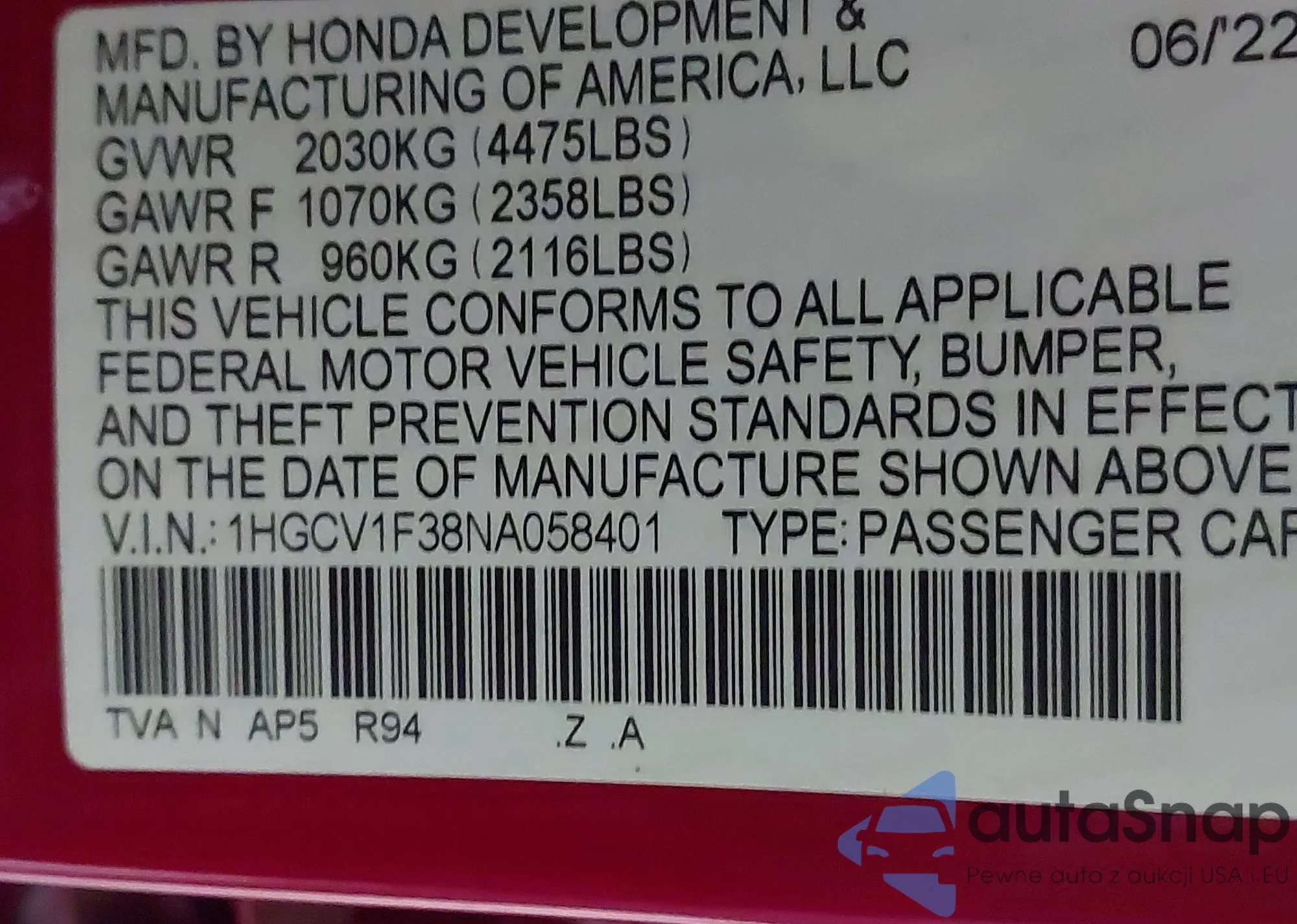 • VIN 1HGCV1F38NA058401
