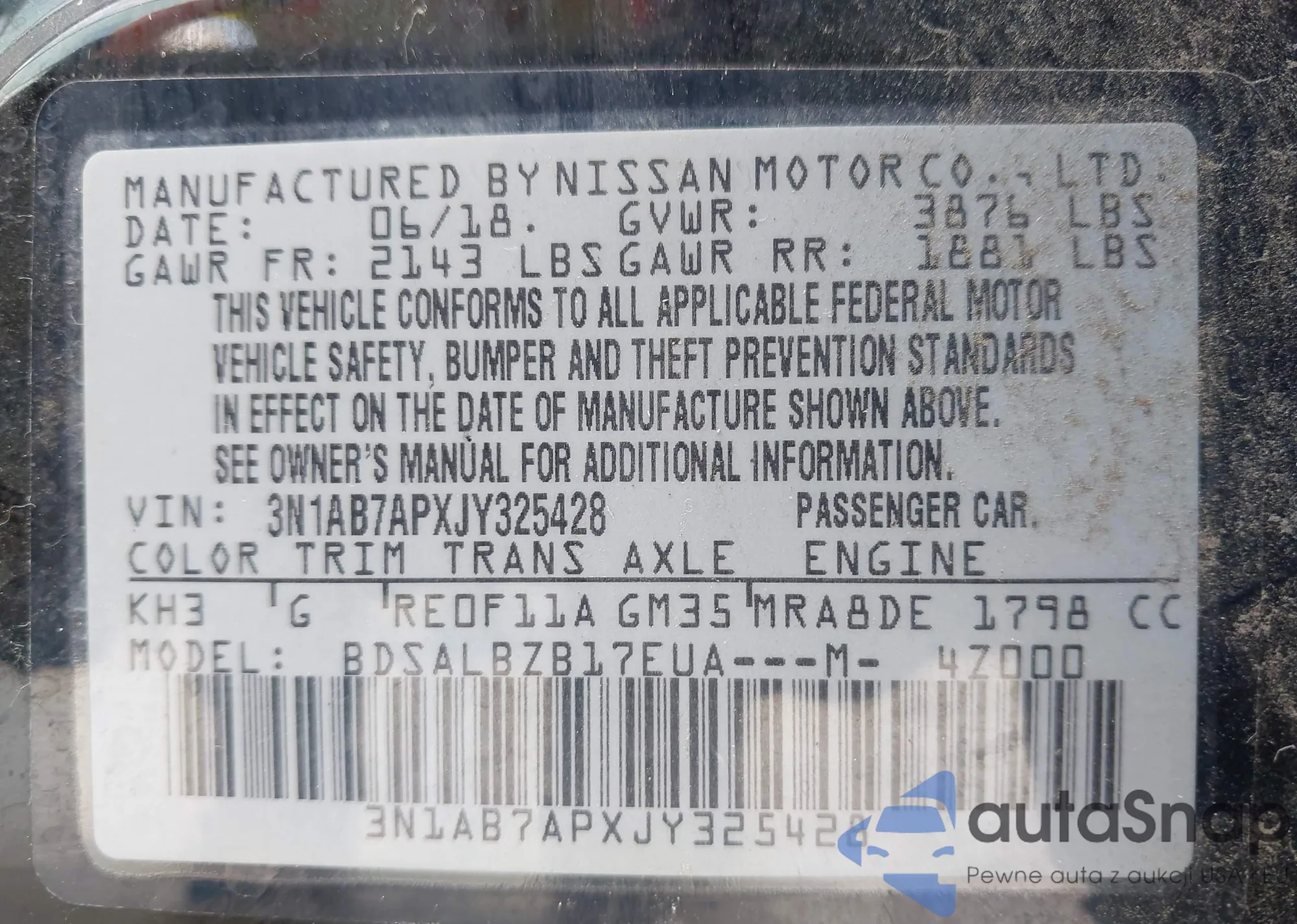 LOT: 42133369 VIN: 3N1AB7APXJY325428