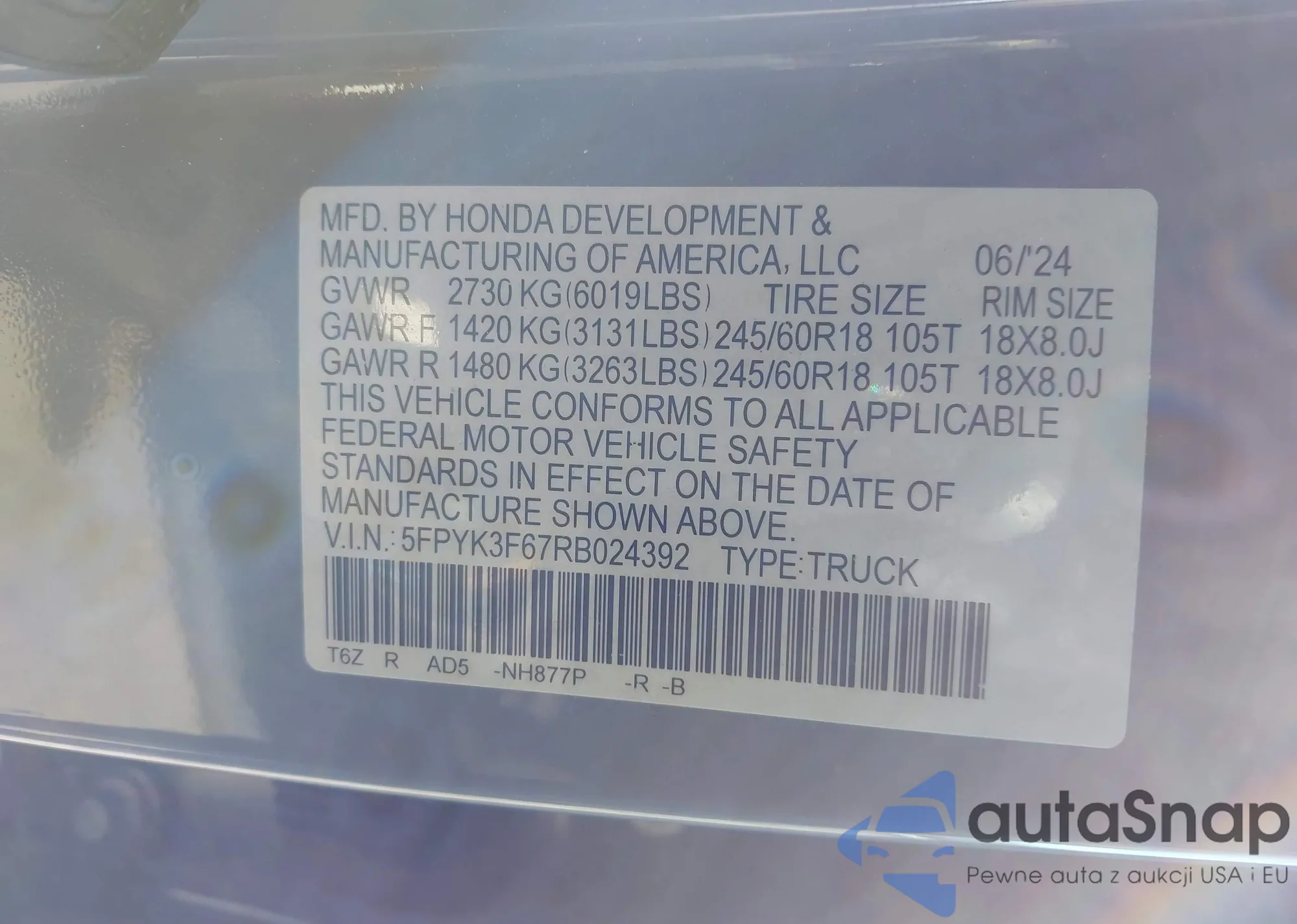 • VIN 5FPYK3F67RB024392