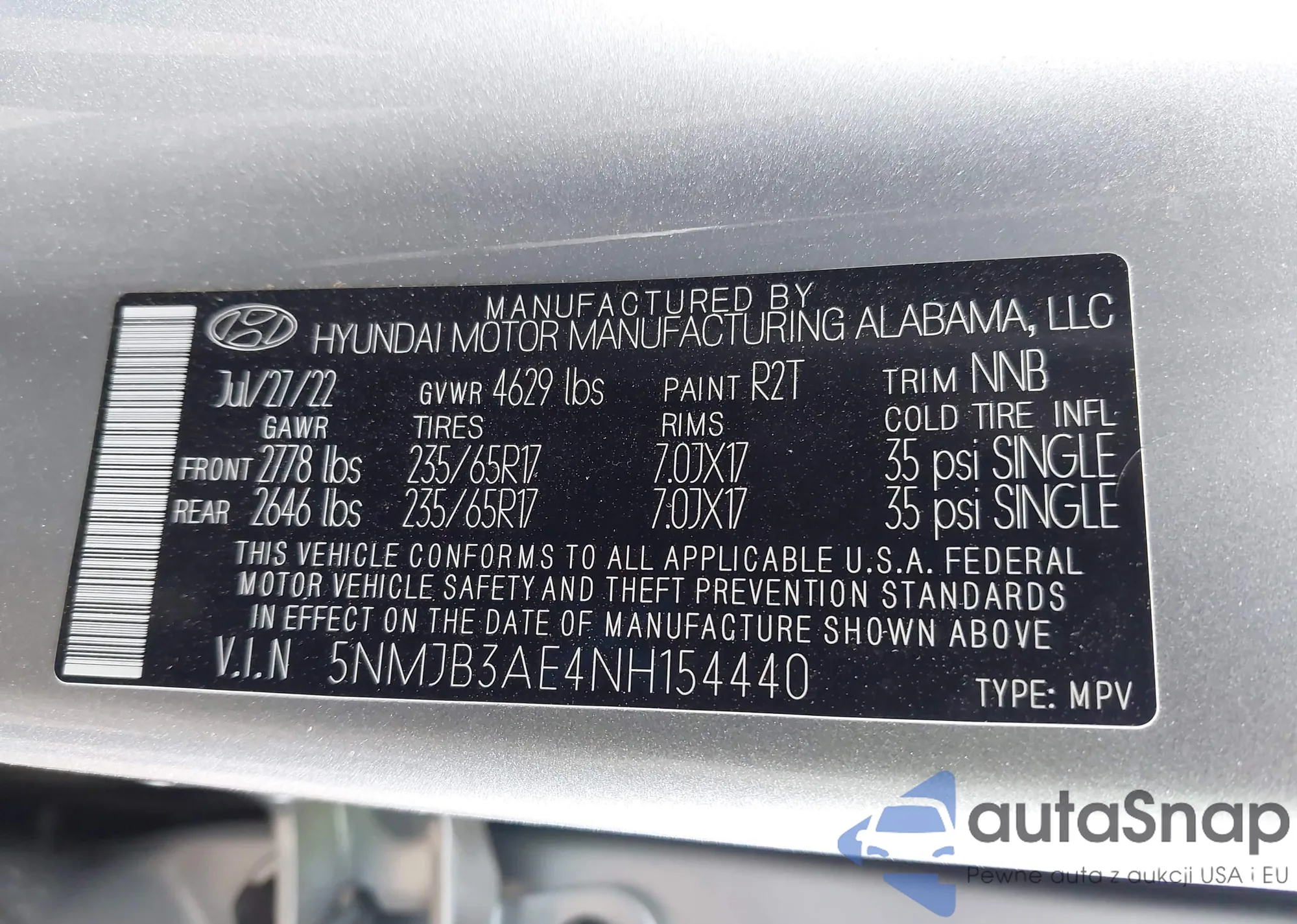 • VIN 5NMJB3AE4NH154440