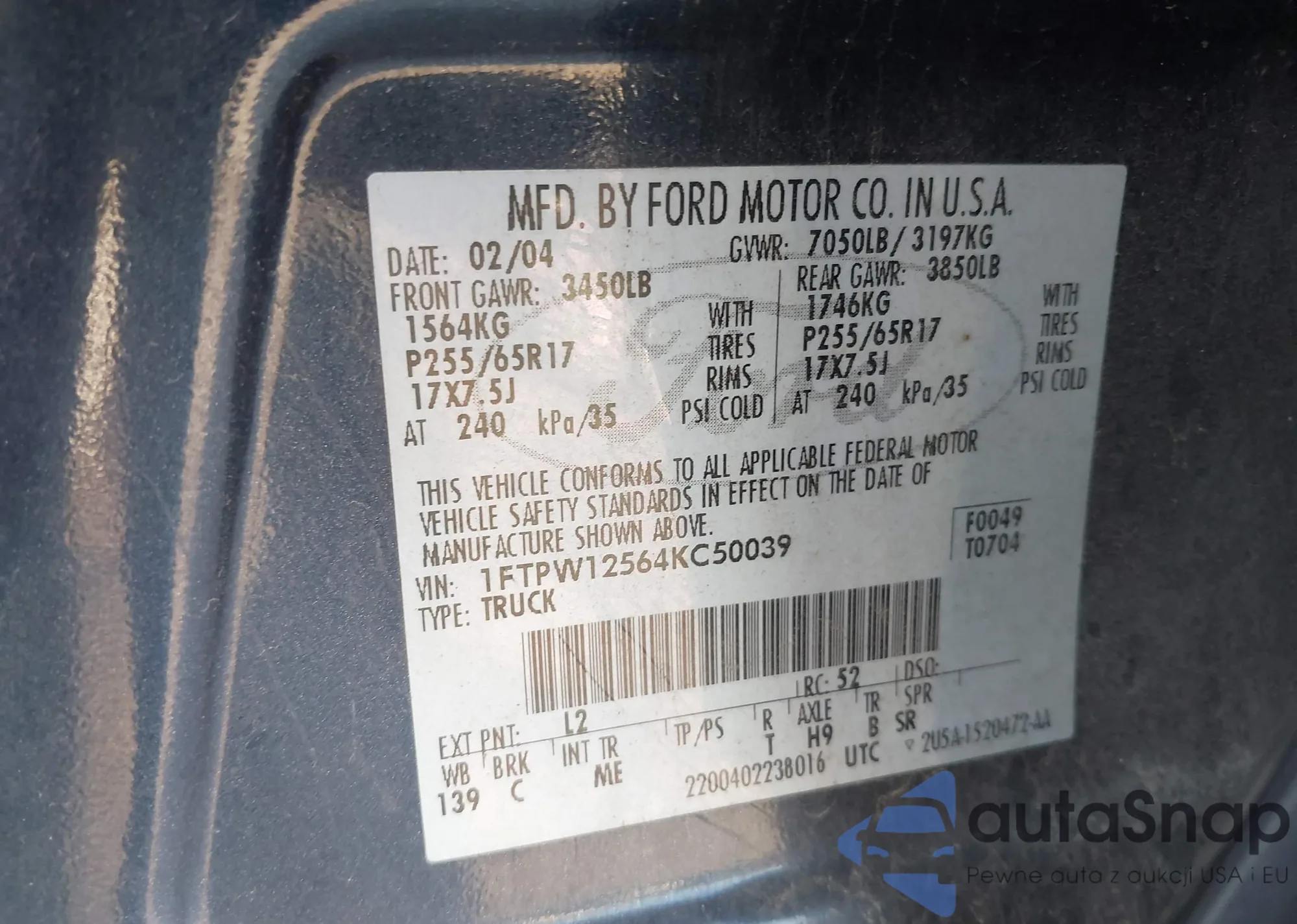 • VIN 1FTPW12564KC50039