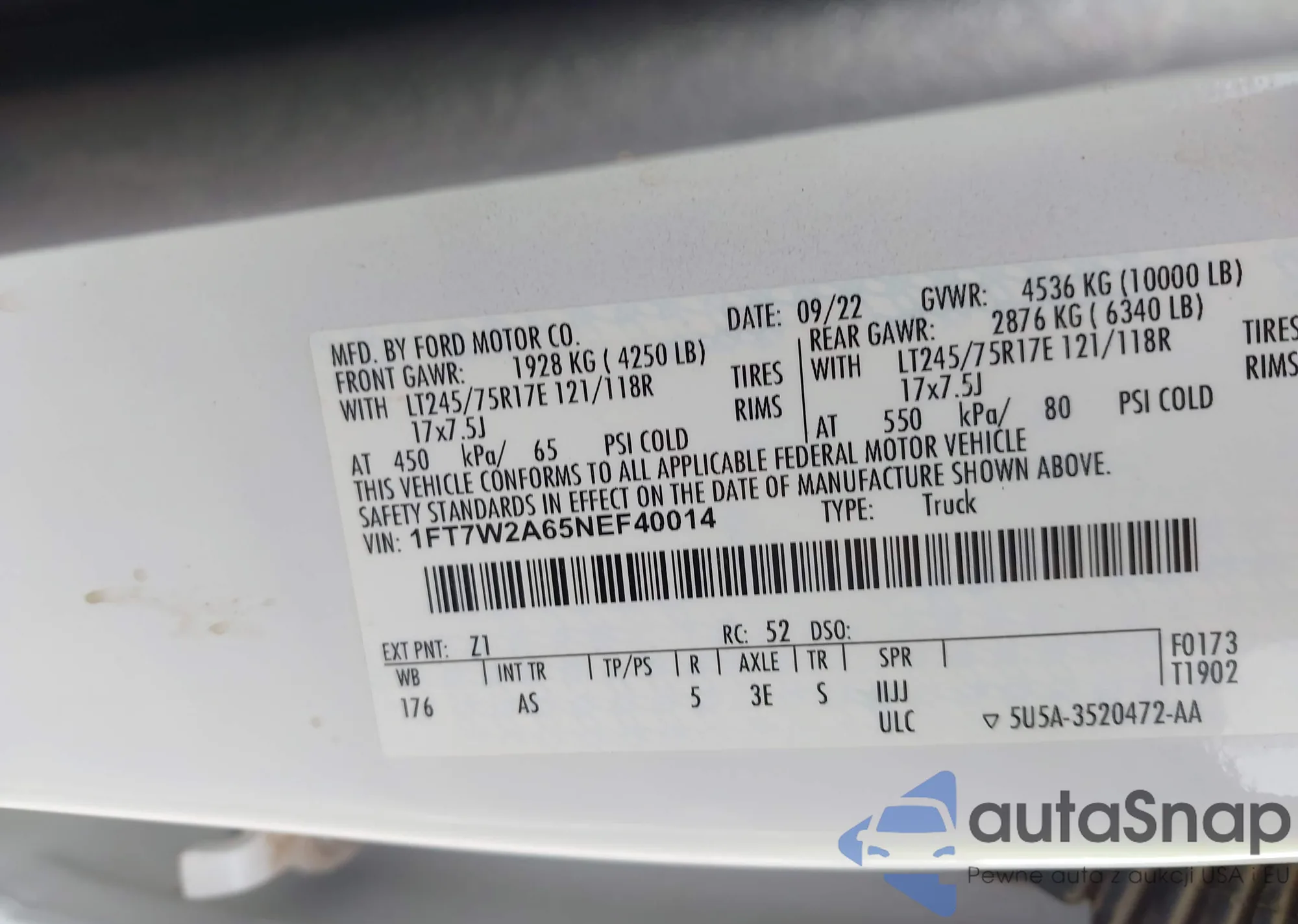 LOT: 42192214 VIN: 1FT7W2A65NEF40014