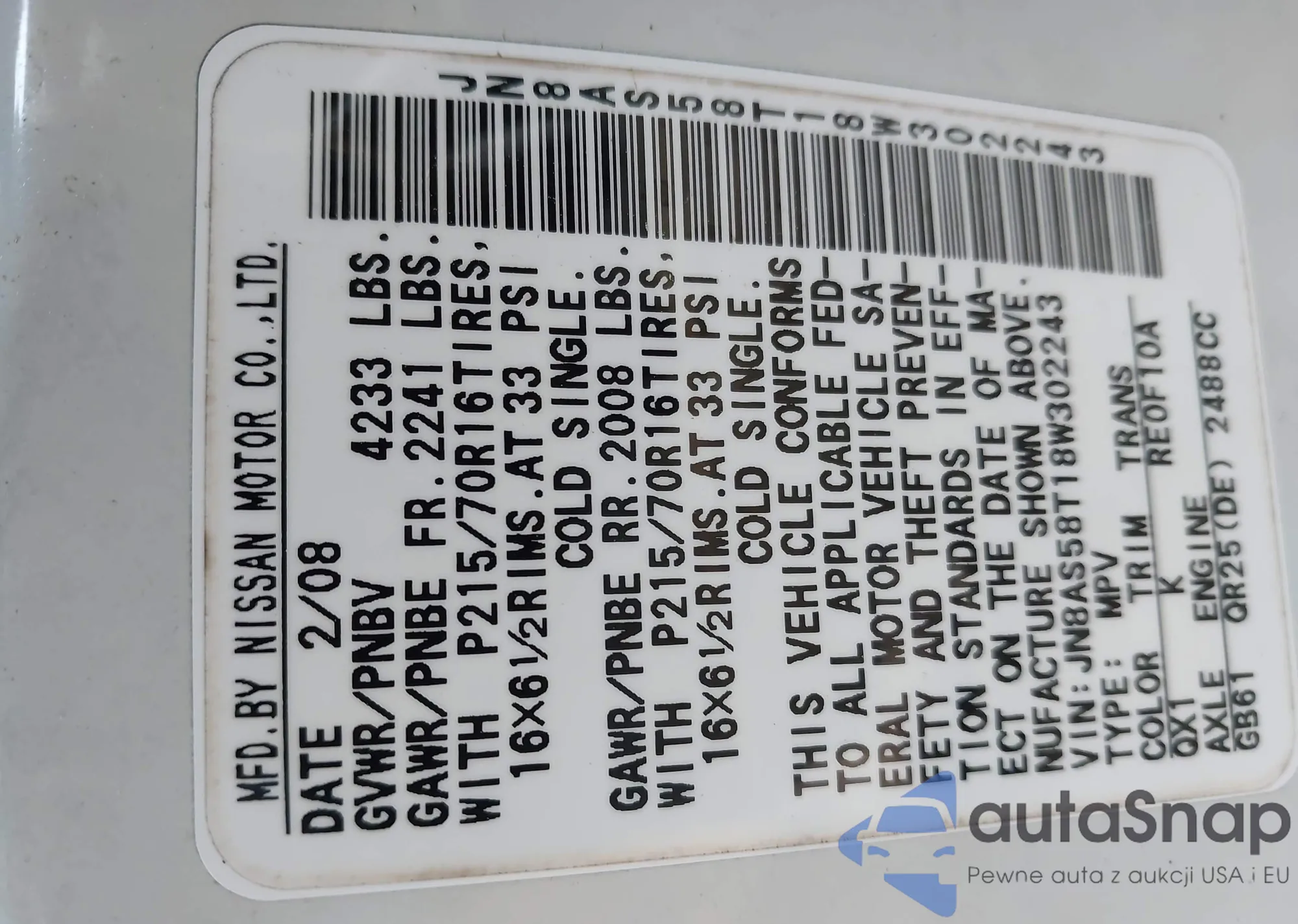 LOT: 42076985 VIN: JN8AS58T18W302243