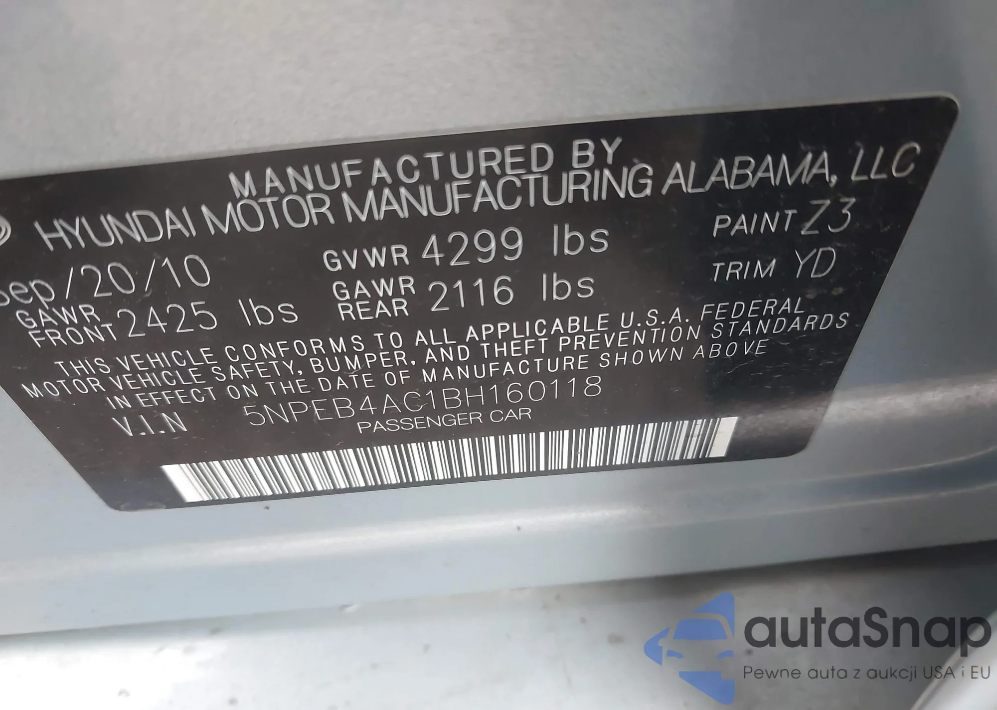 • VIN 5NPEB4AC1BH160118
