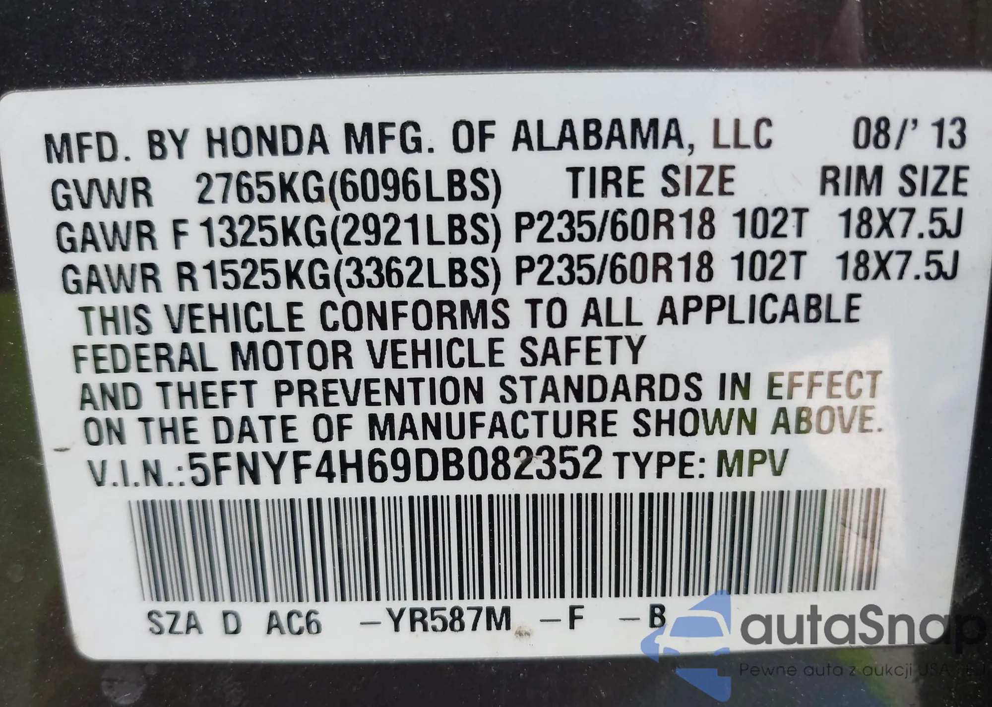 • VIN 5FNYF4H69DB082352