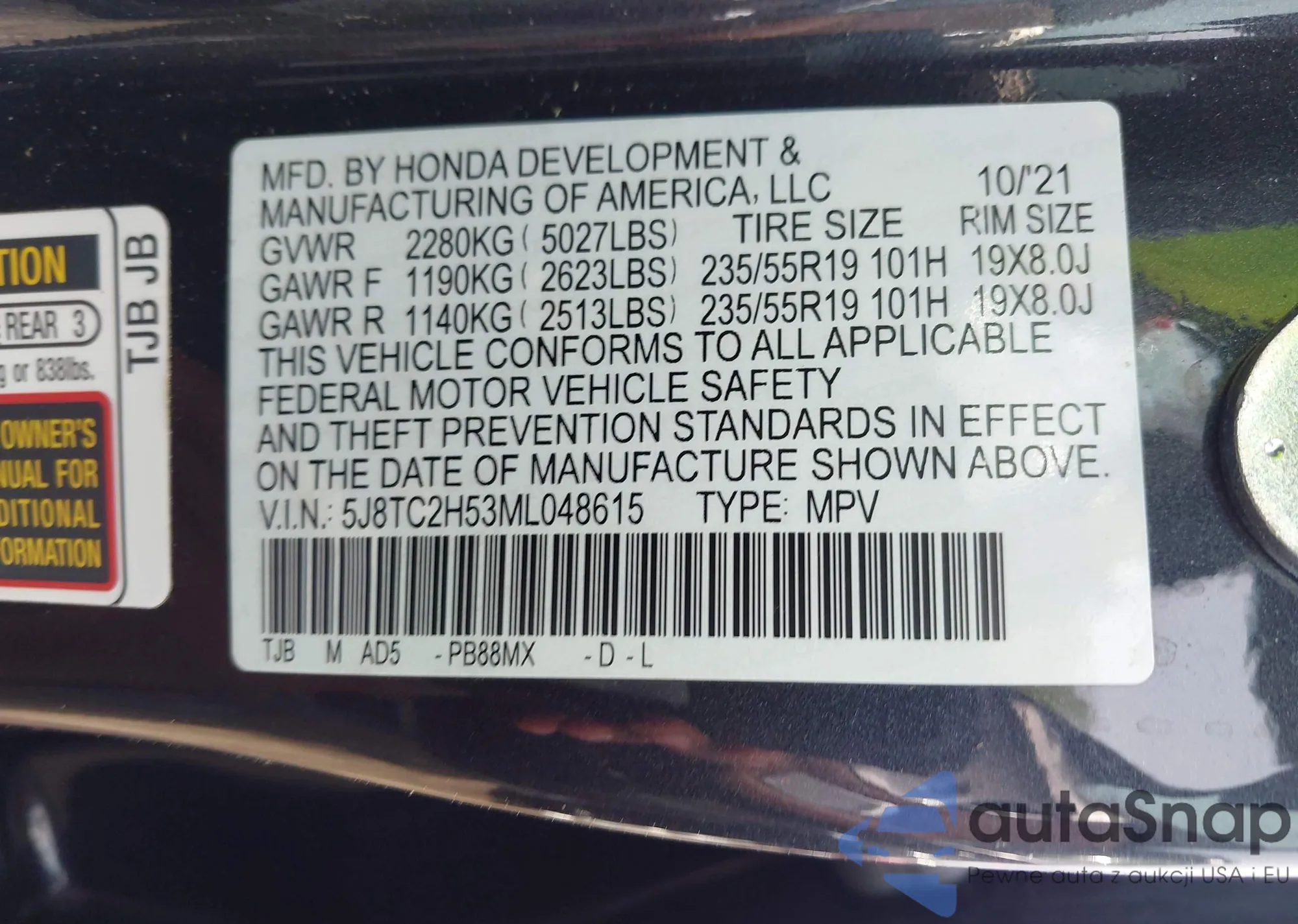 LOT: 41921499 VIN: 5FNYF4H69DB082352