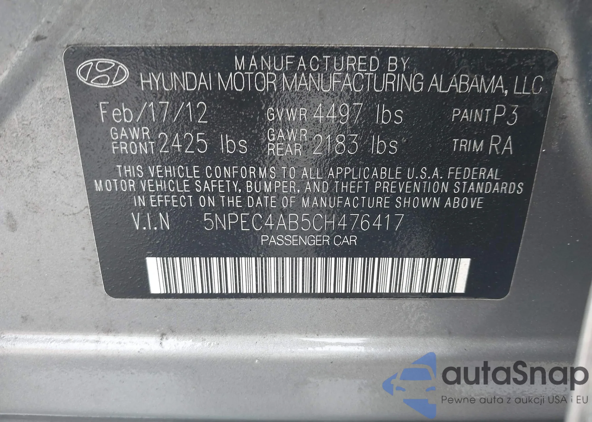 • VIN 5NPEC4AB5CH476417