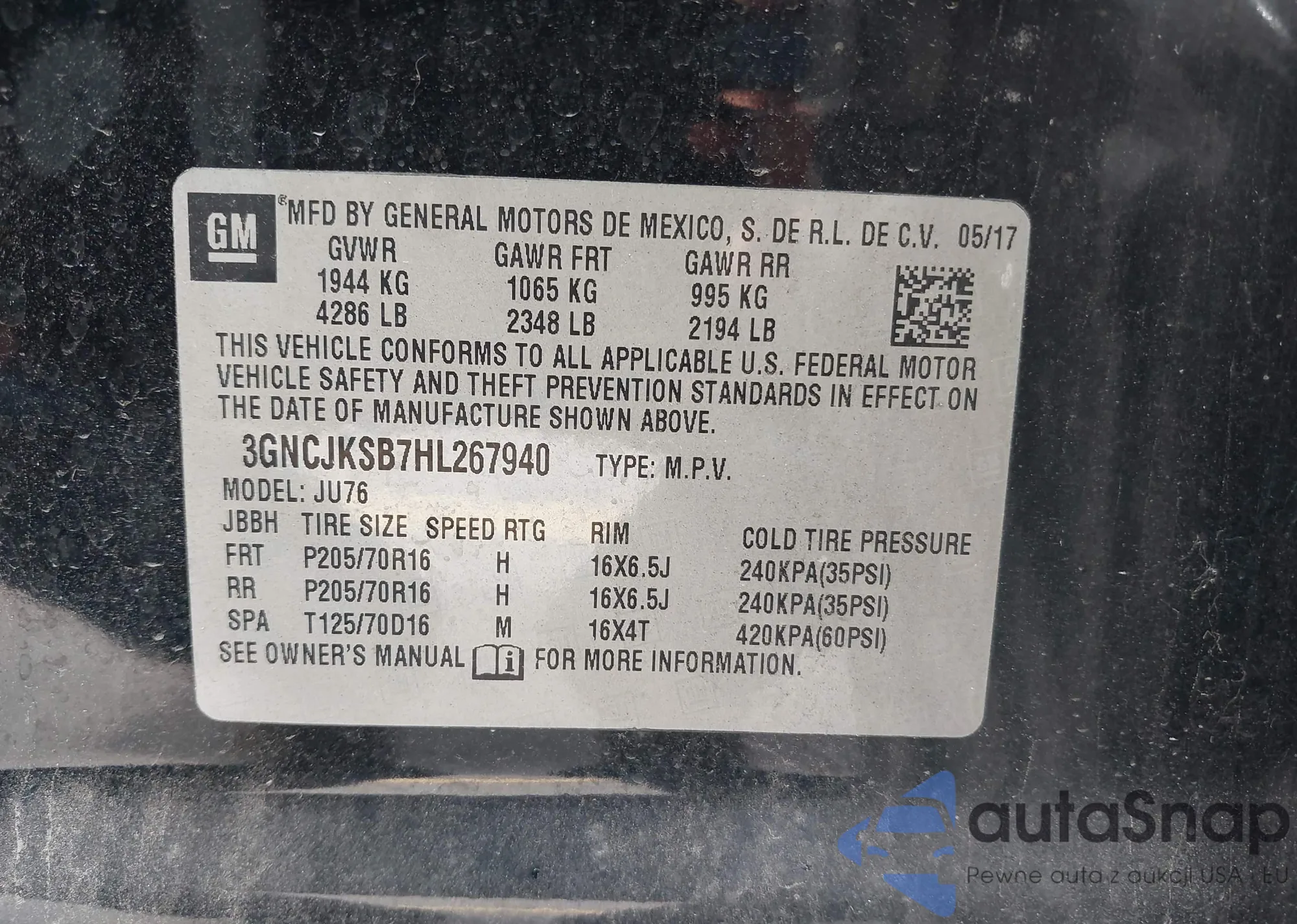 • VIN 3GNCJKSB7HL267940