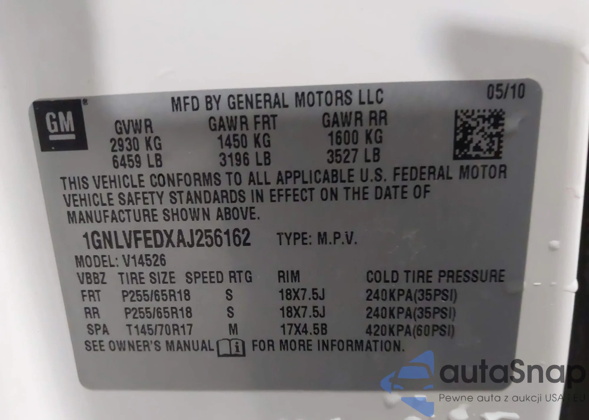 • VIN 1GNLVFEDXAJ256162
