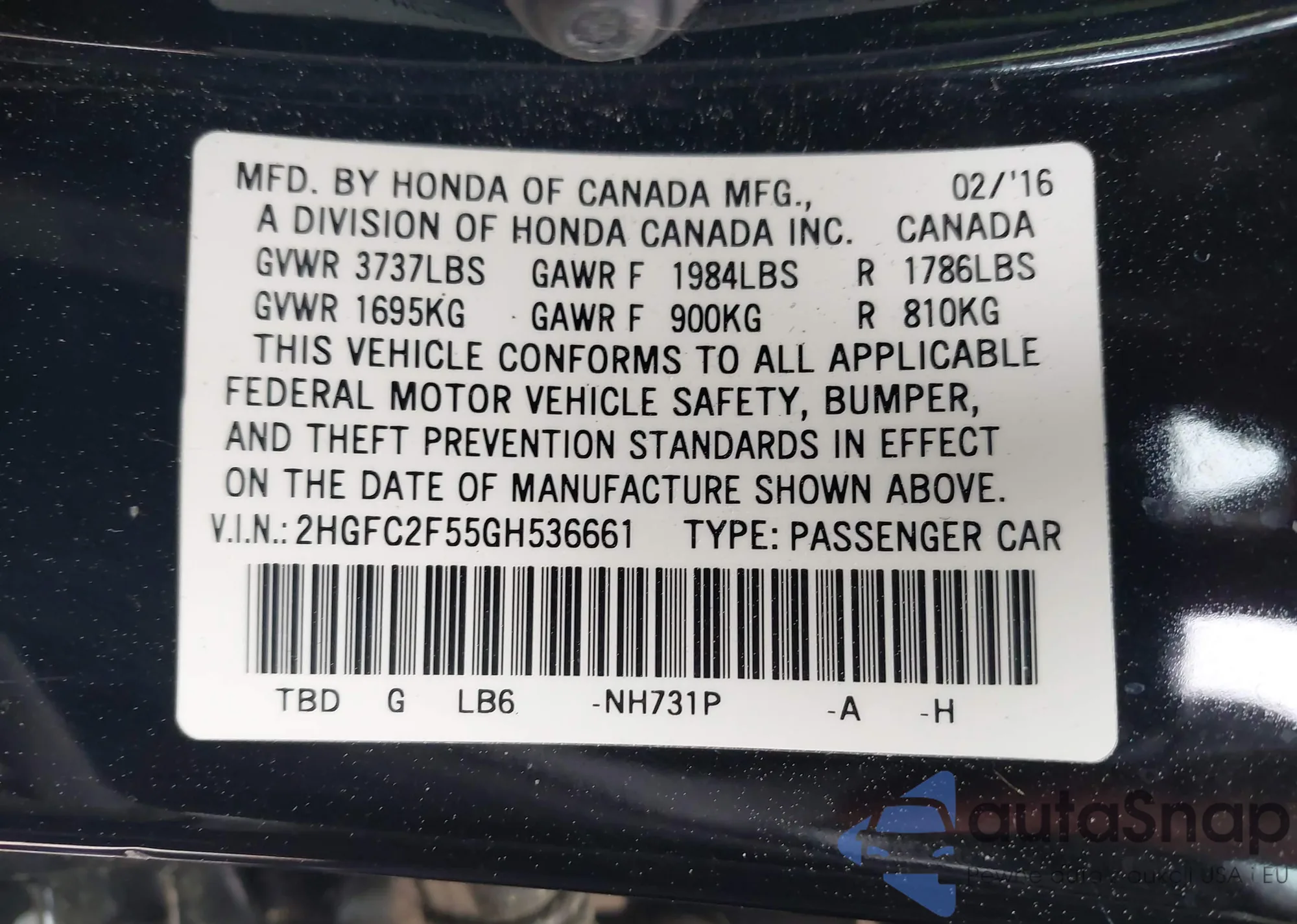 • VIN 2HGFC2F55GH536661