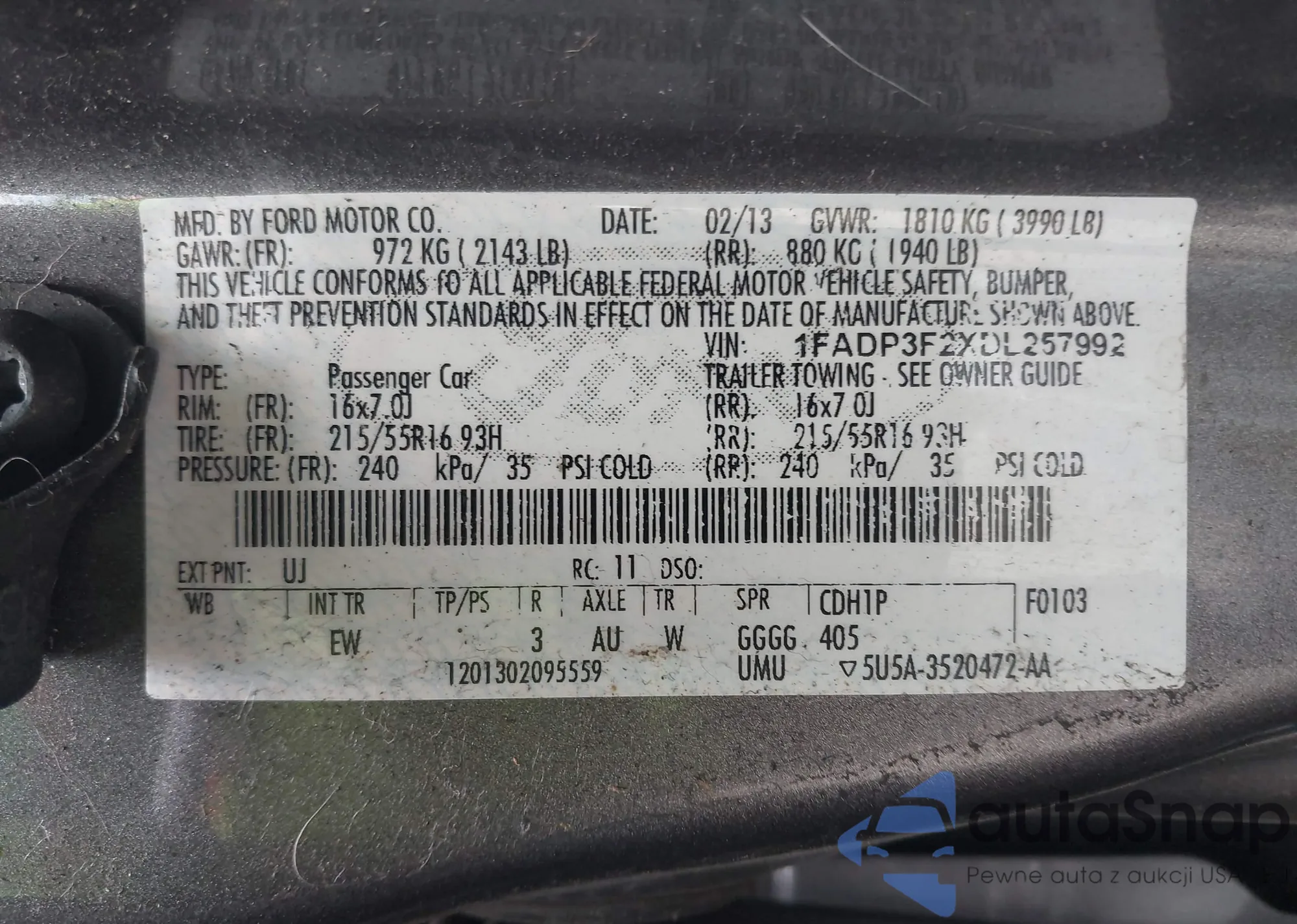 • VIN 1FADP3F2XDL257992