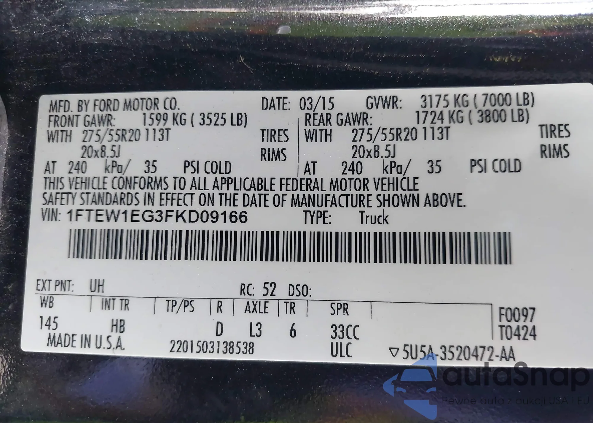 LOT: 42352309 VIN: 1FTEW1EG3FKD09166