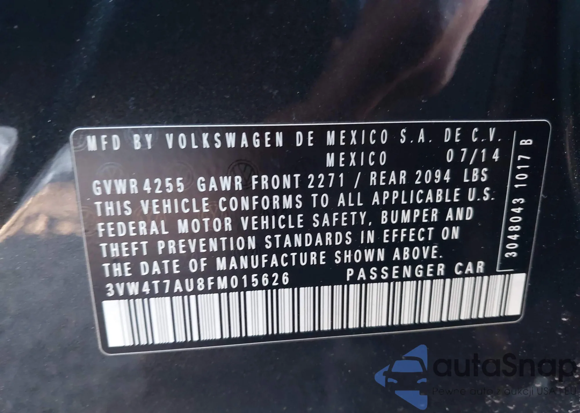 • VIN 3VW4T7AU8FM015626