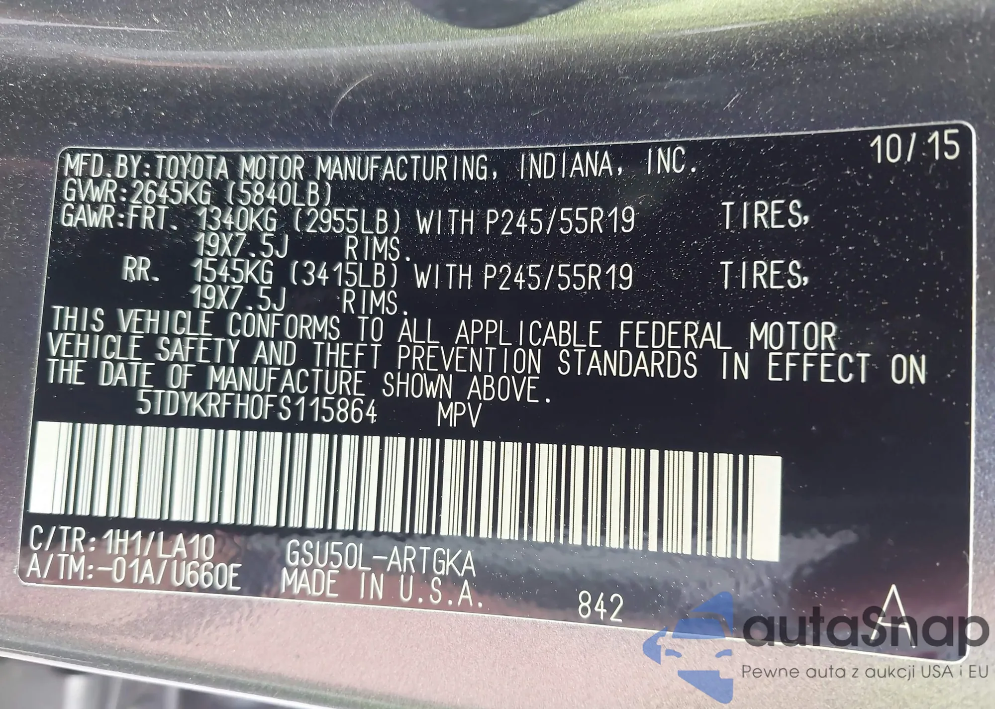 LOT: 42145018 VIN: 5TDYKRFH0FS115864