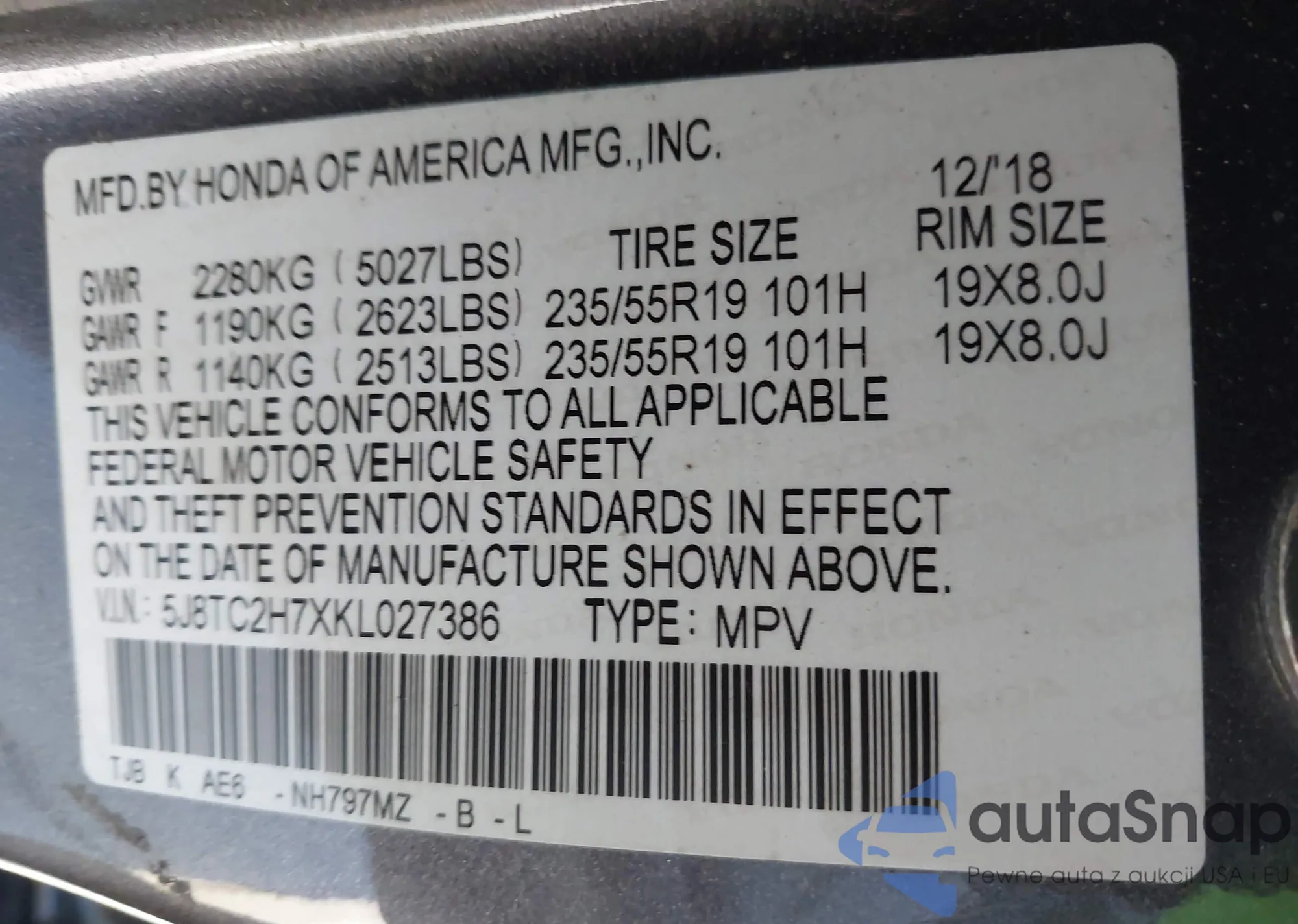 LOT: 41309827 VIN: 5J8TC2H7XKL027386