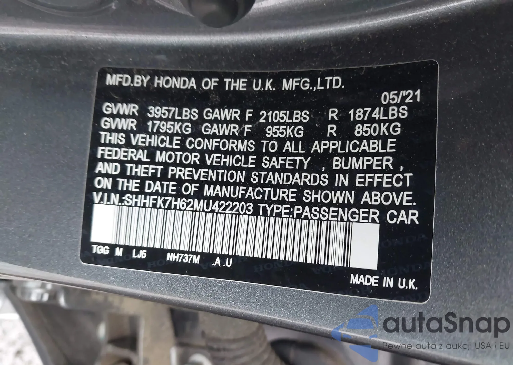 LOT: 42284728 VIN: JHMGD38637S015957