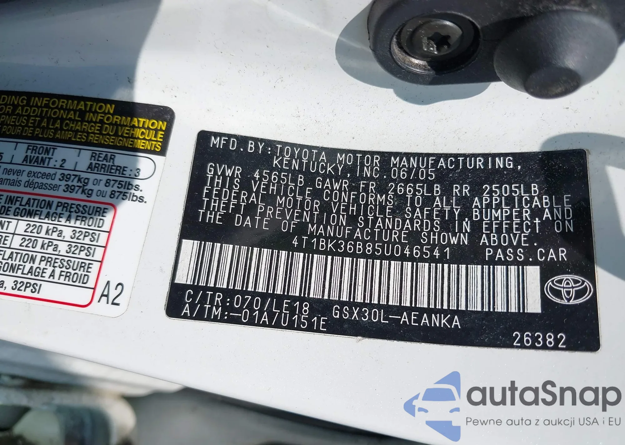 LOT: 42281097 VIN: 4T1BK36B85U046541