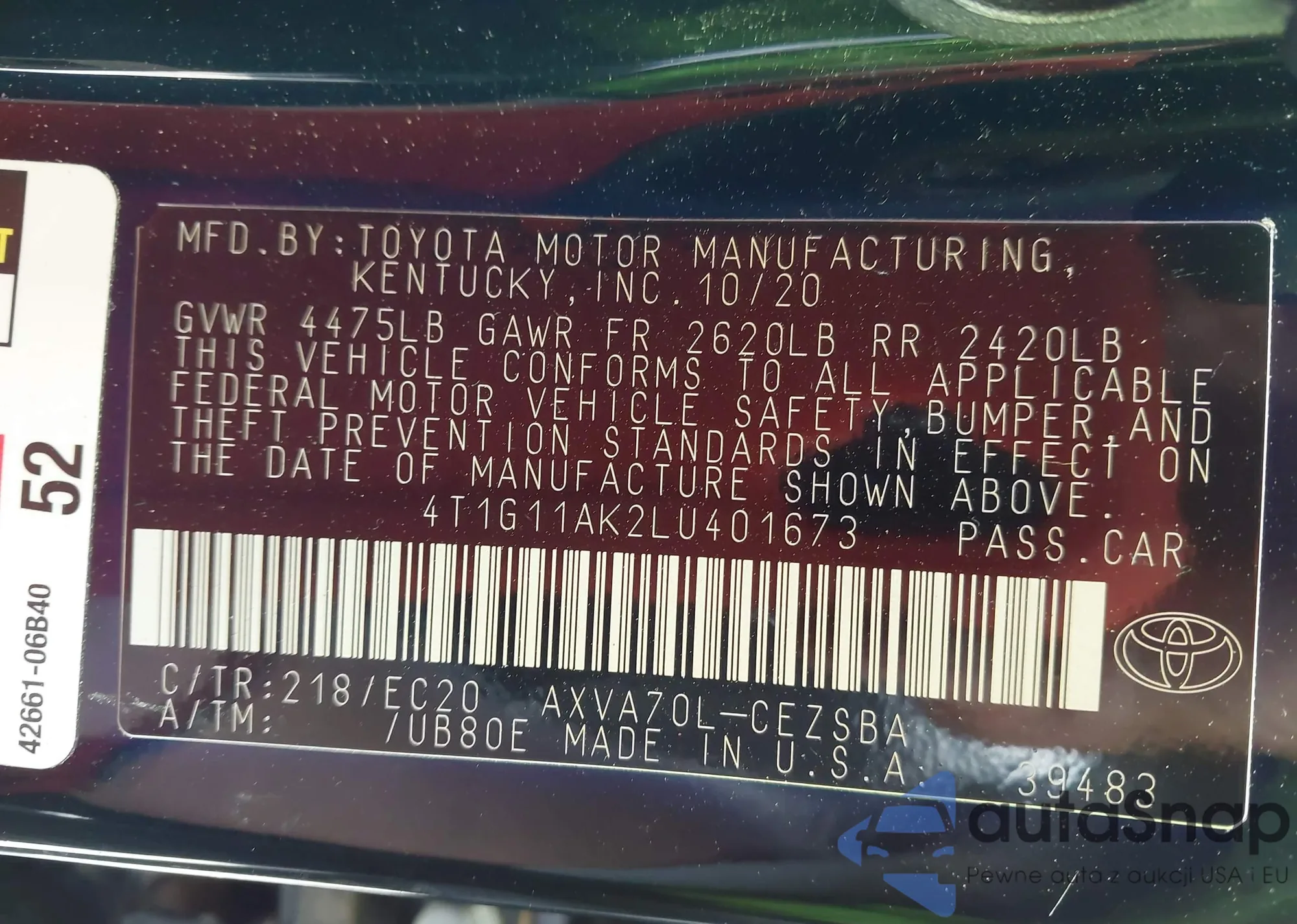 LOT: 42128330 VIN: 4T1B31HK4KU008573