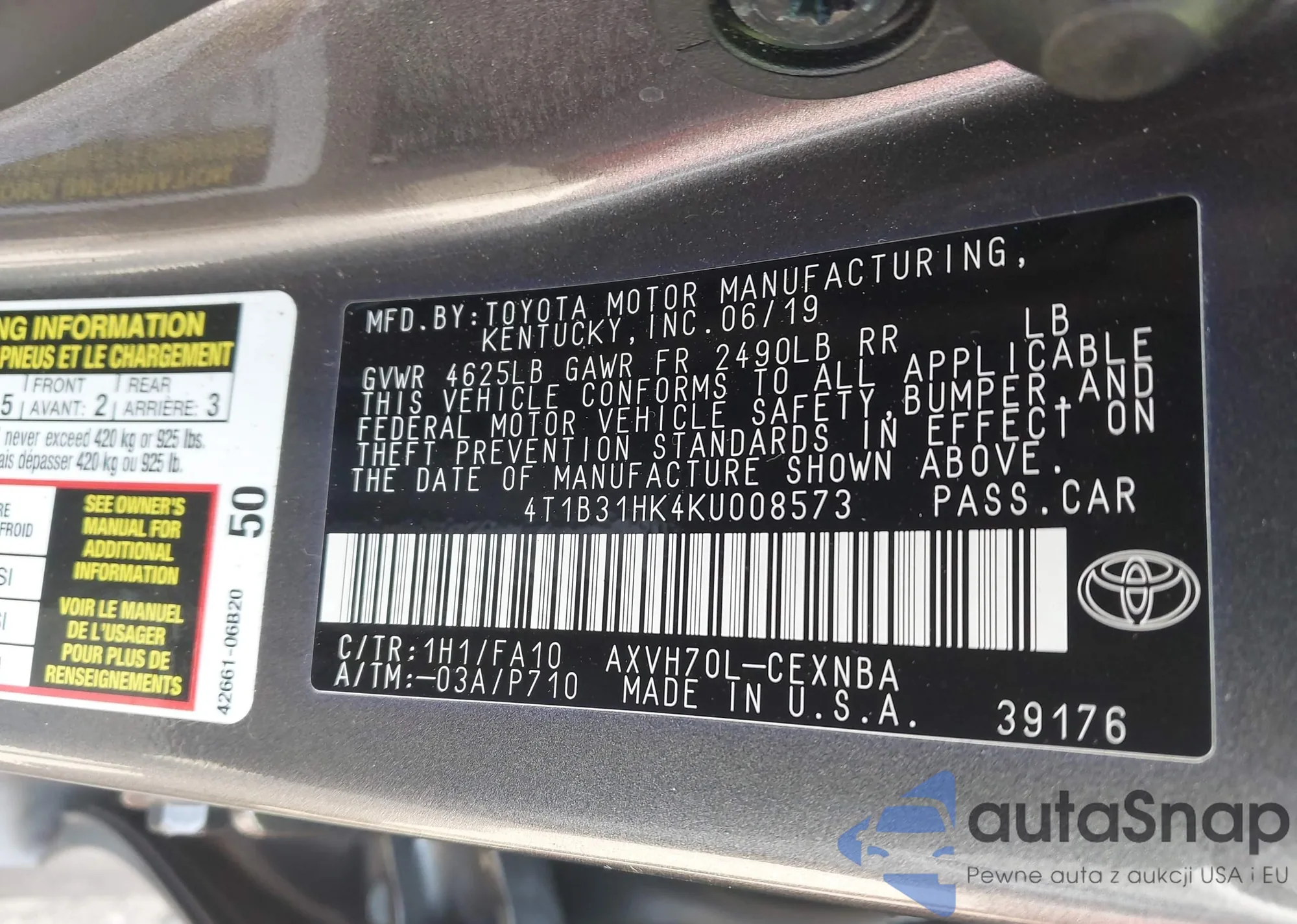 • VIN 4T1B31HK4KU008573