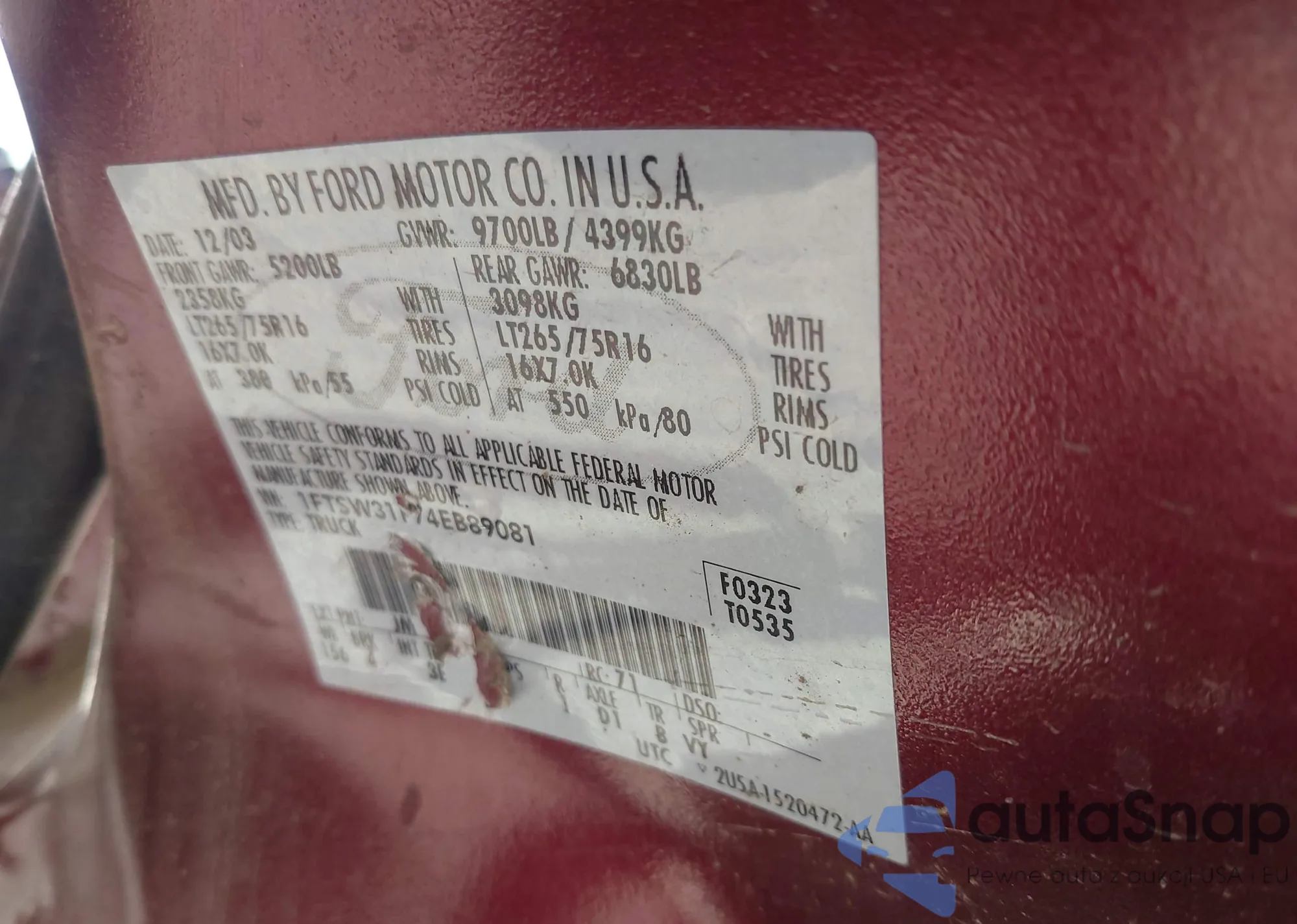 LOT: 42233053 VIN: 1FTSW31P74EB89081