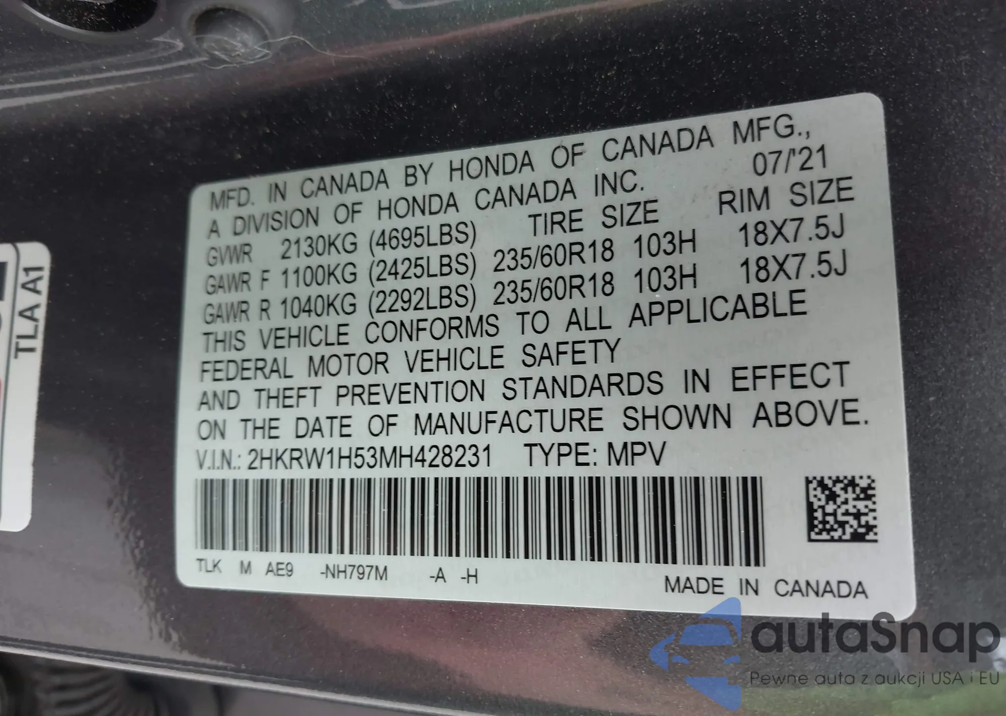 • VIN 3HGGK5H47KM736786
