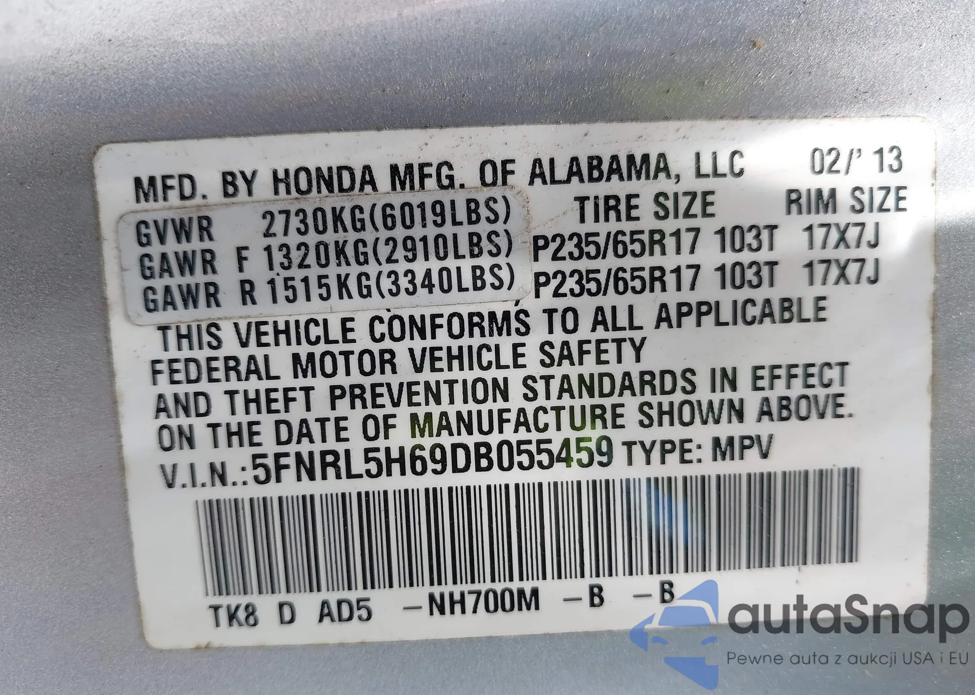 • VIN 5FNRL5H69DB055459