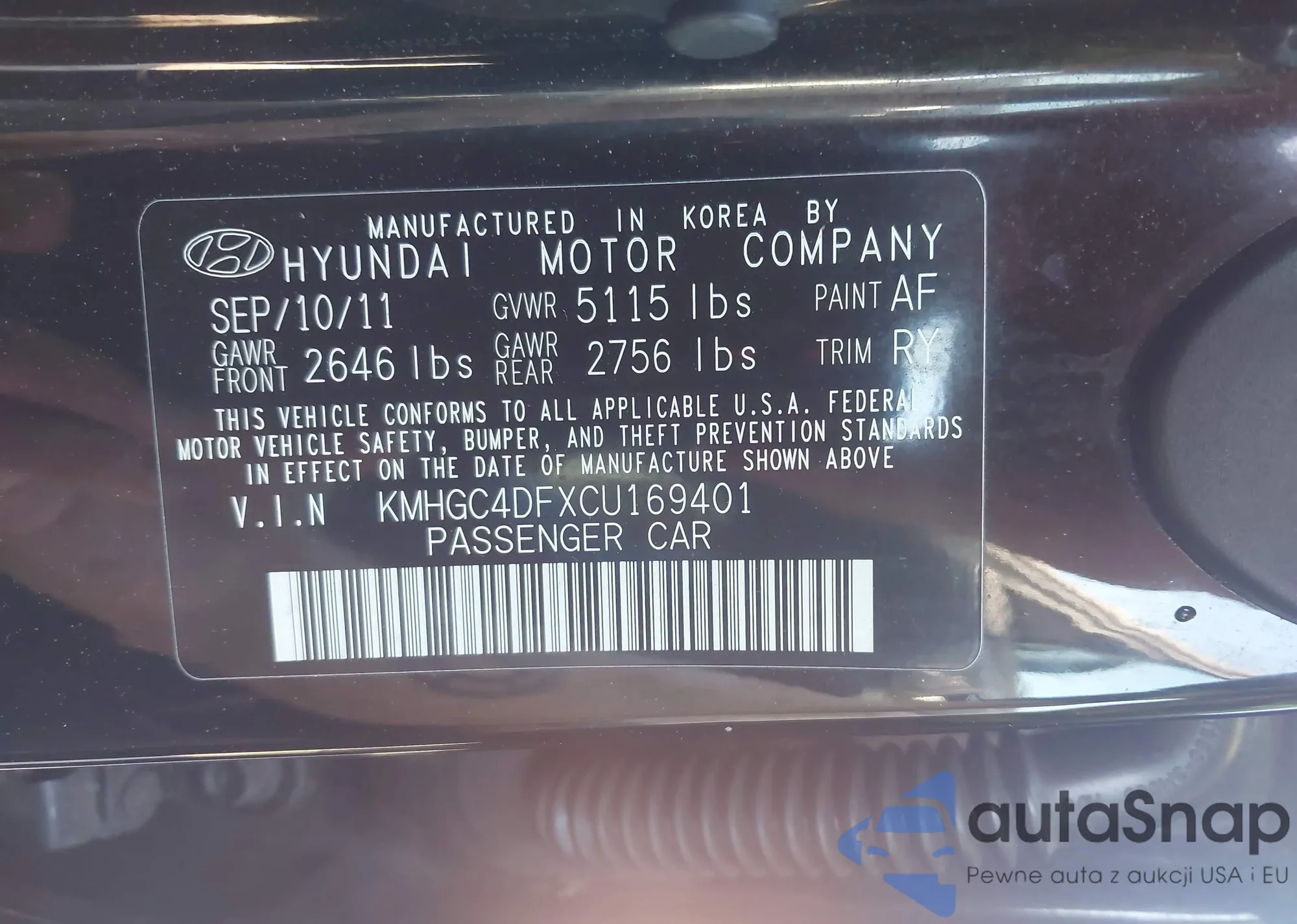 LOT: 42015898 VIN: KMHGC4DFXCU169401