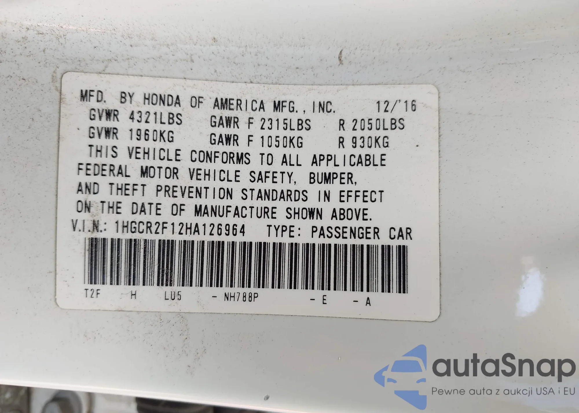 LOT: 42003752 VIN: 1HGCR2F12HA126964
