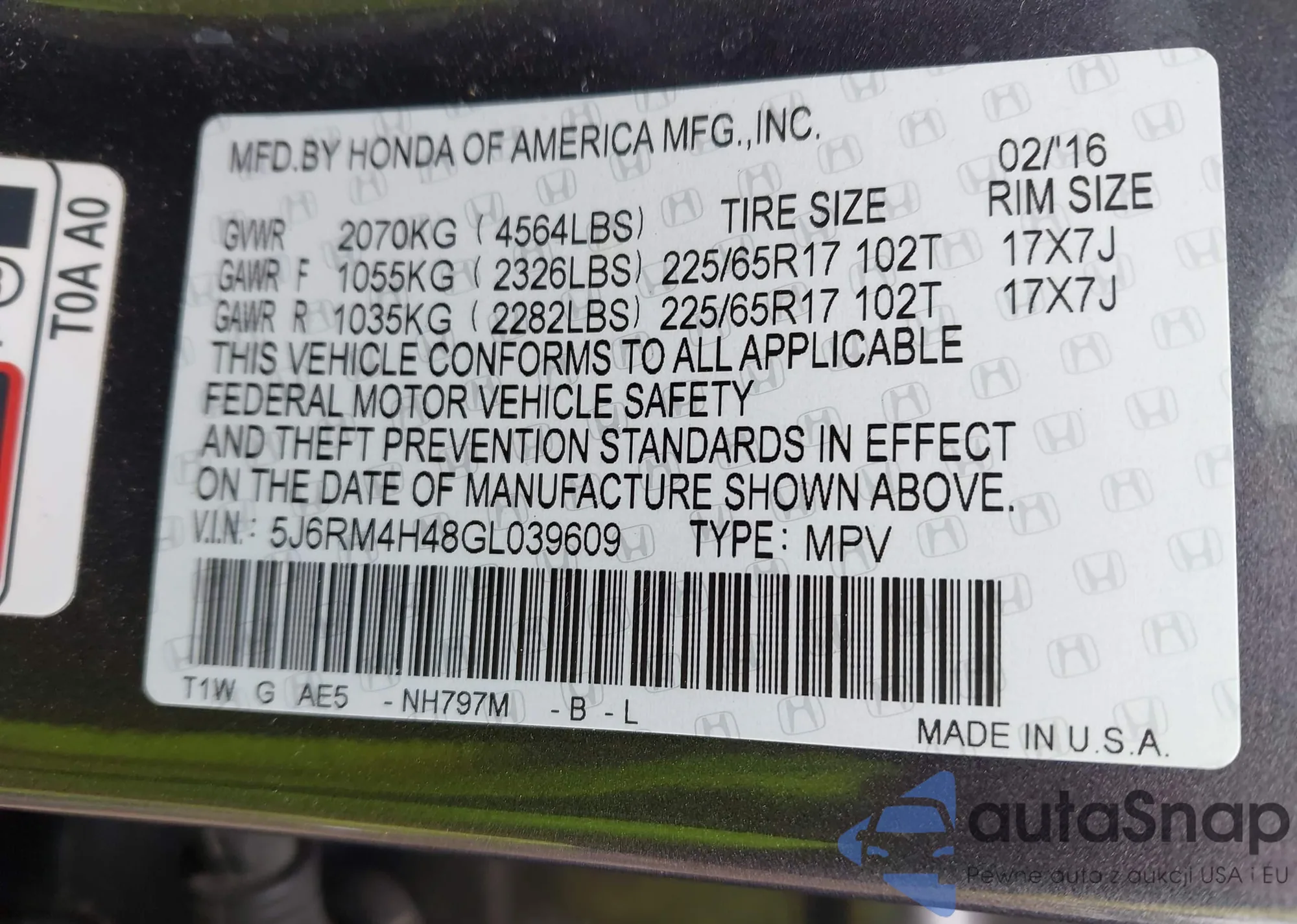 • VIN 5J6RM4H48GL039609