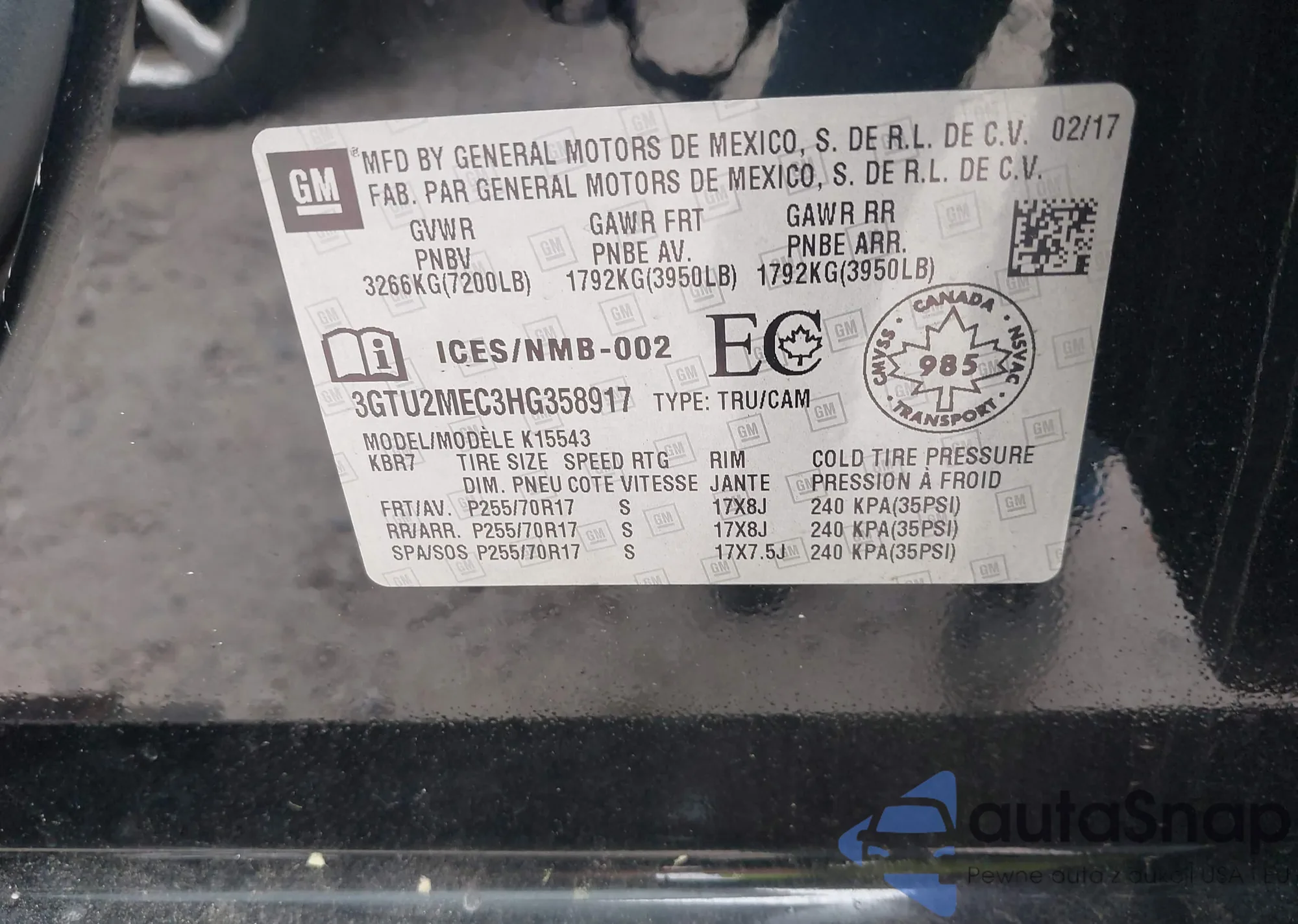 • VIN 3GTU2MEC3HG358917