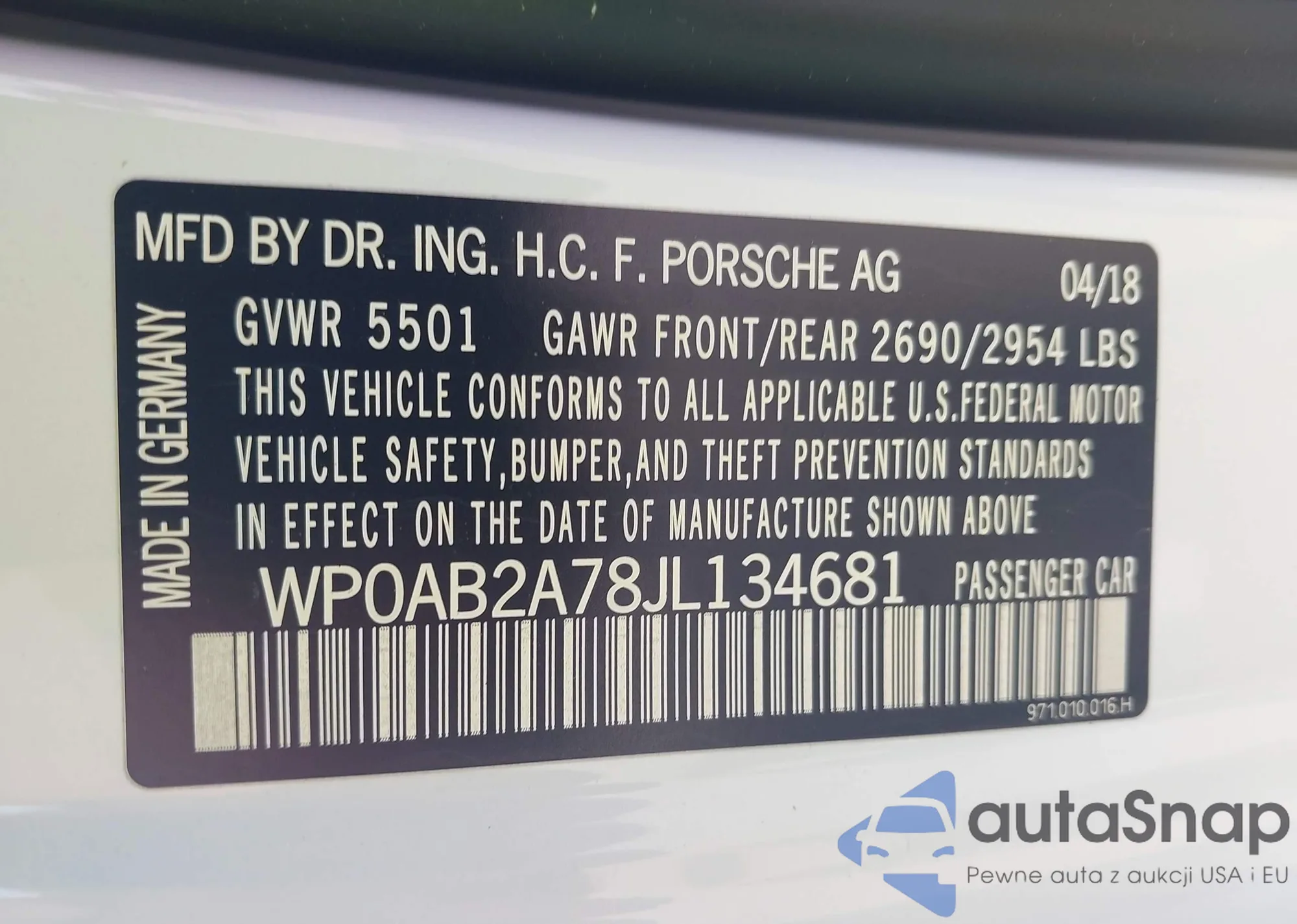 LOT: 41771249 VIN: WP0AB2A78JL134681