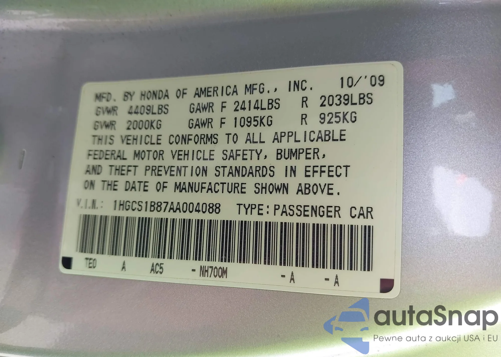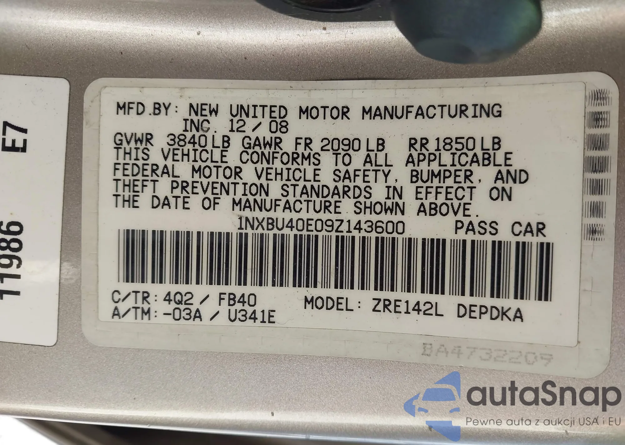 LOT: 42141093 VIN: 1NXBU40E09Z143600