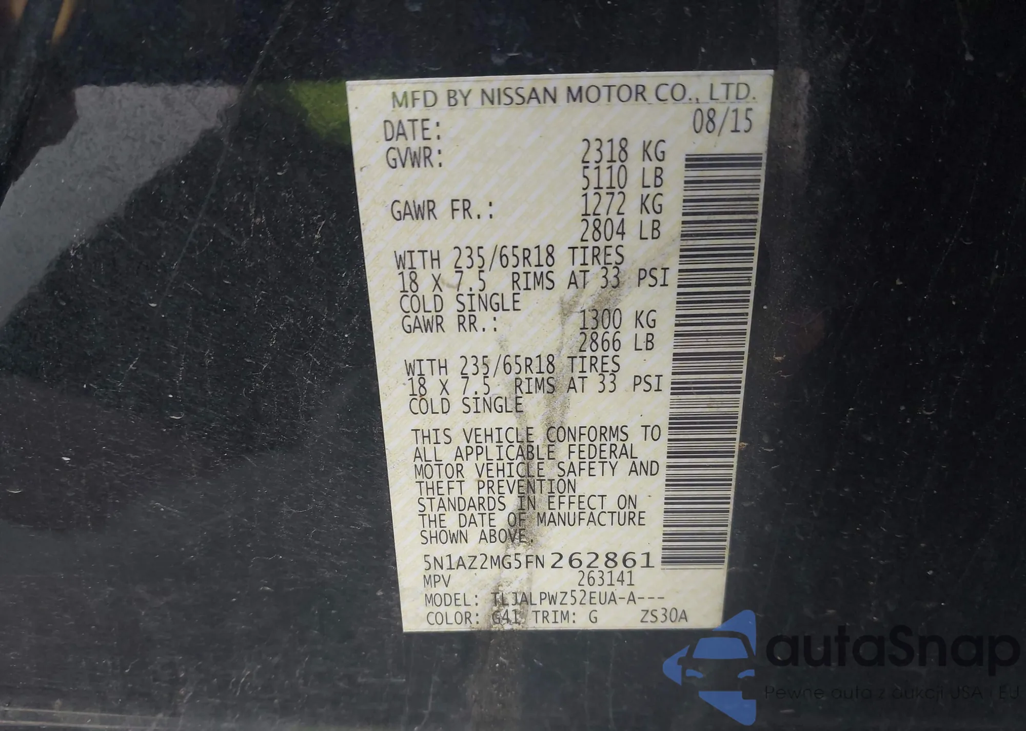 • VIN 5N1AZ2MG5FN262861