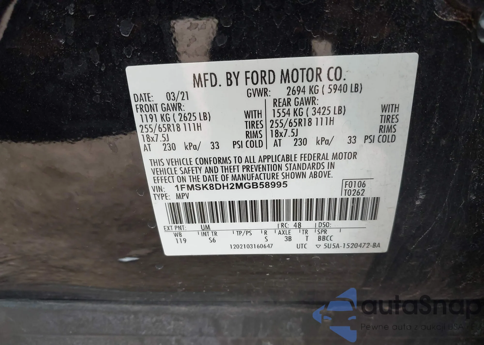 LOT: 41835350 VIN: 1FMSK8DH2MGB58995