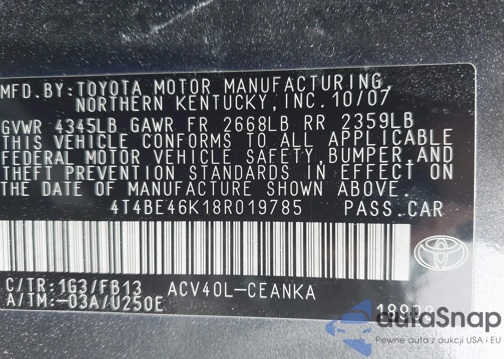 LOT: 42269590 VIN: 4T4BE46K18R019785