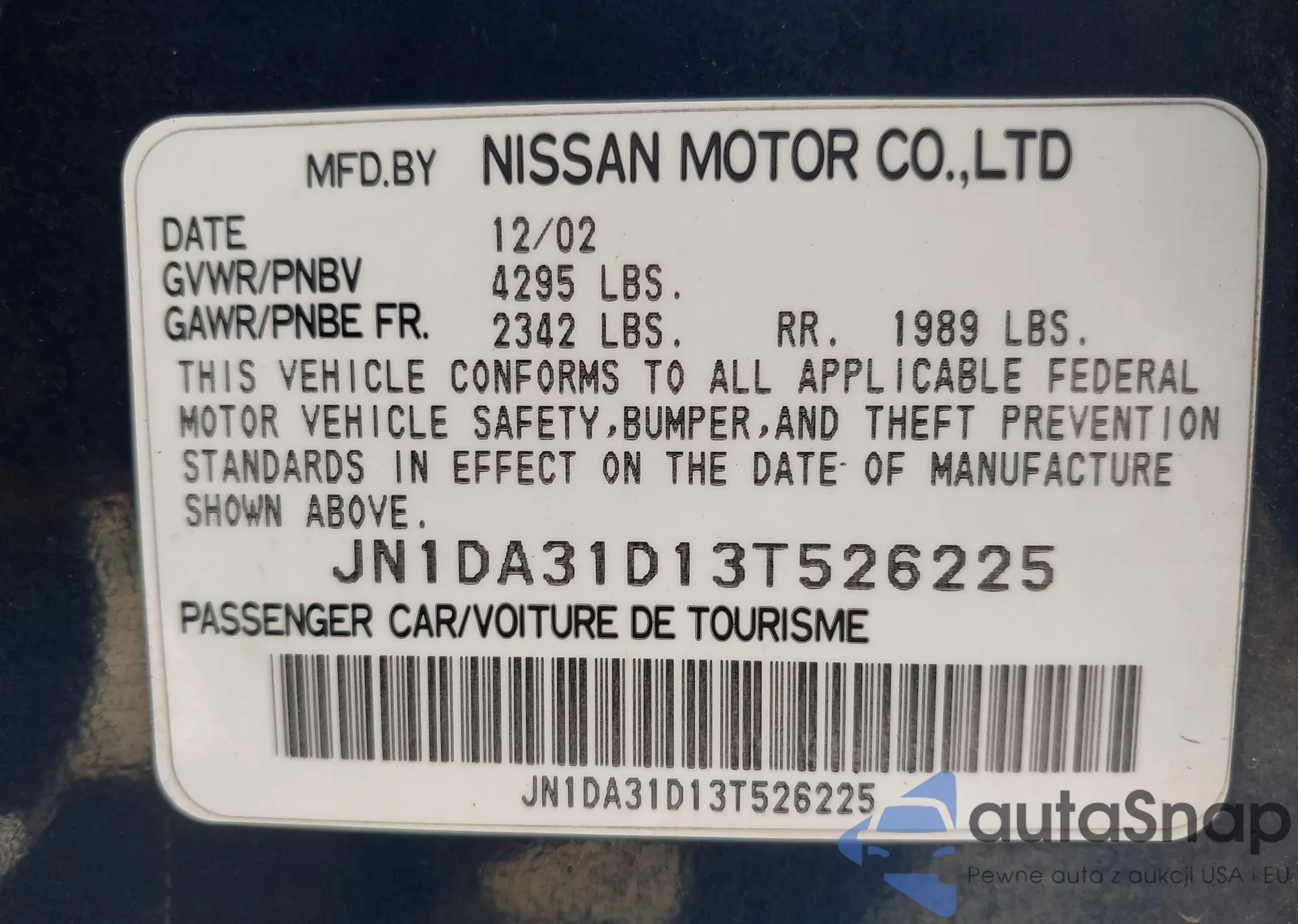 LOT: 42215175 VIN: JN1DA31D13T526225