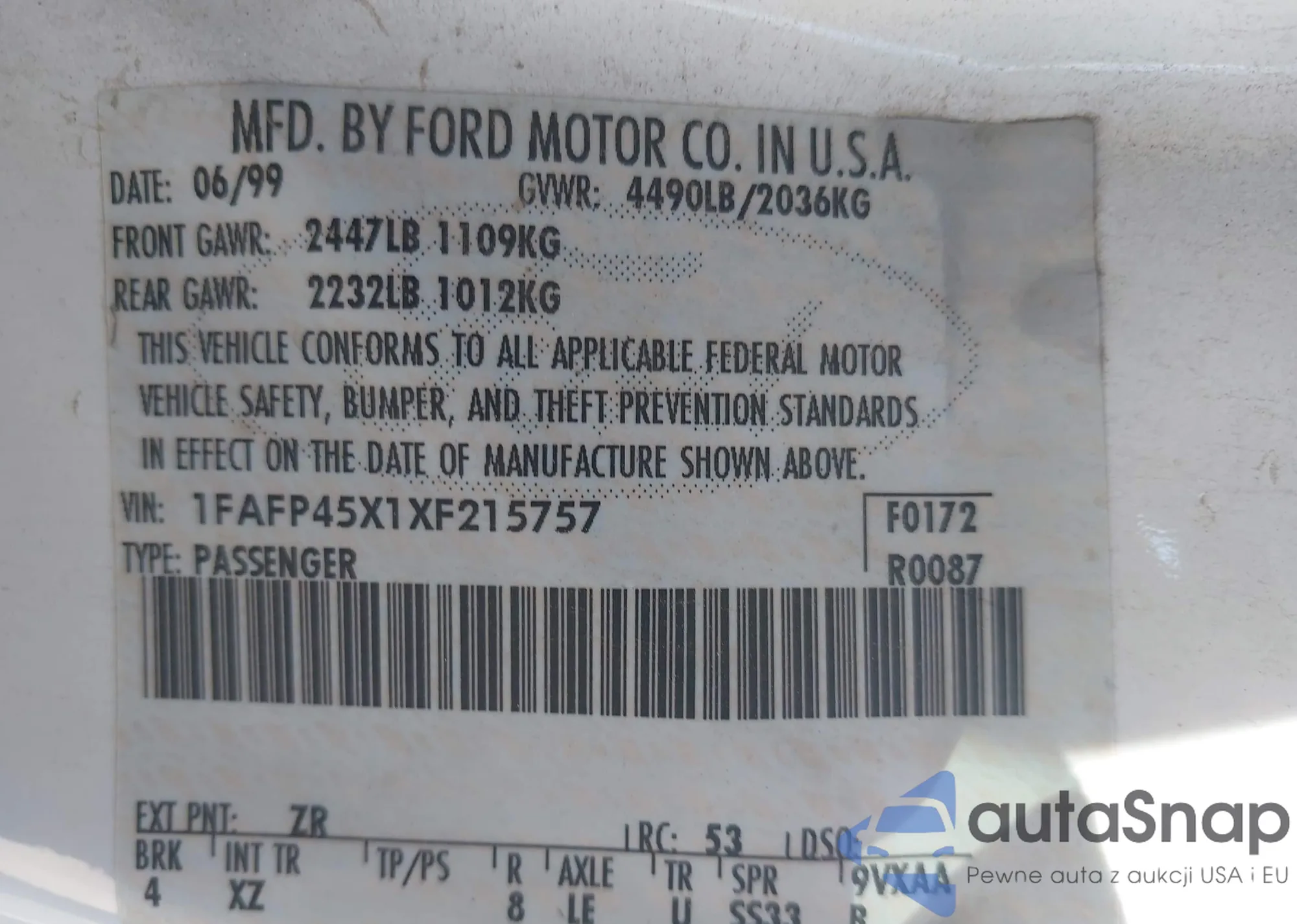LOT: 42311086 VIN: 1FAFP45X1XF215757