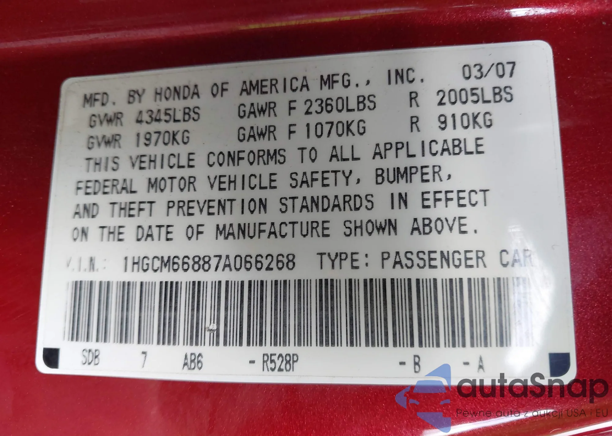 LOT: 41573483 VIN: 1HGCM66887A066268