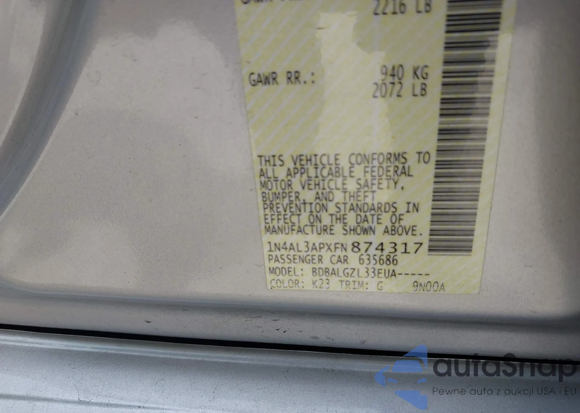 LOT: 42277814 VIN: 1N4AL3APXFN874317