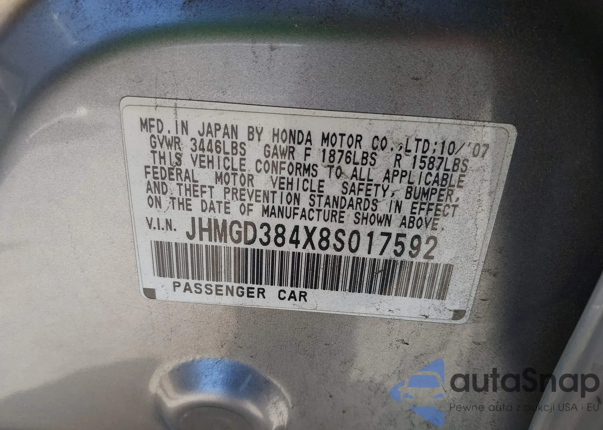 • VIN JHMGD384X8S017592