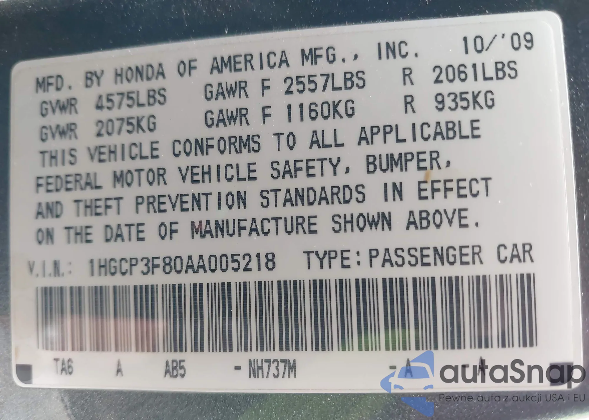LOT: 42323835 VIN: 1HGCP3F80AA005218