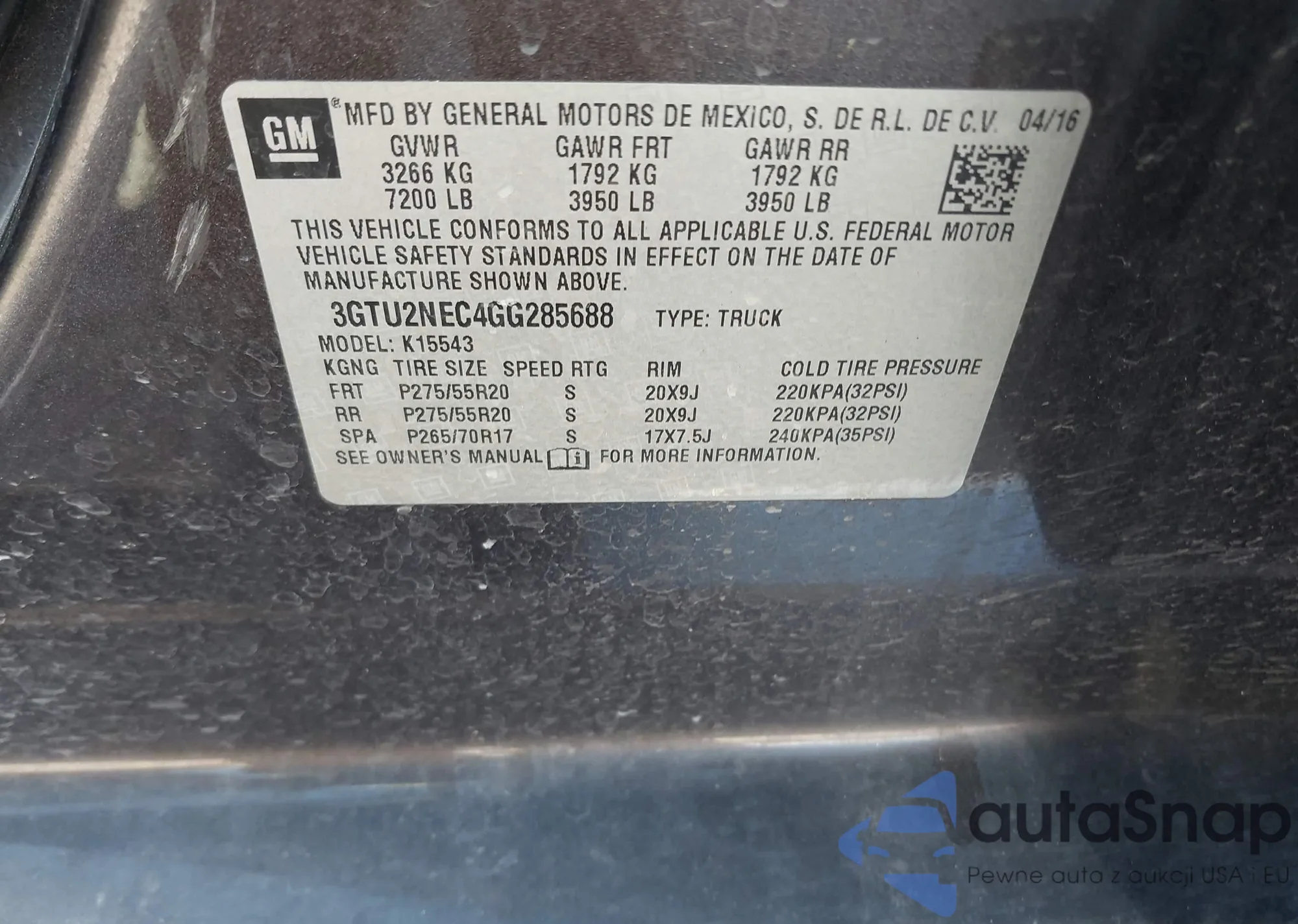 LOT: 40394598 VIN: 3GTU2NEC4GG285688