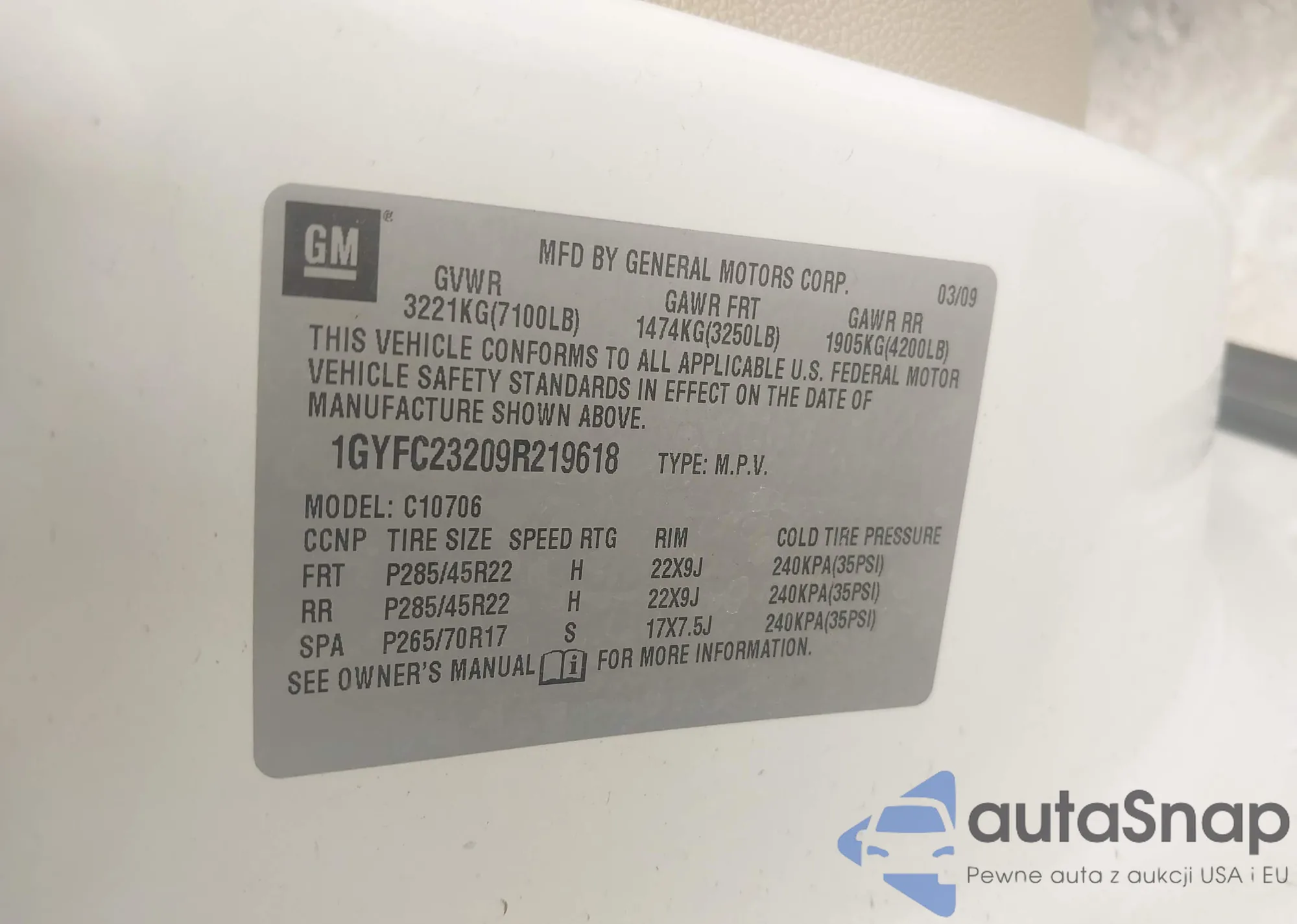LOT: 42294452 VIN: 1GYFC23209R219618