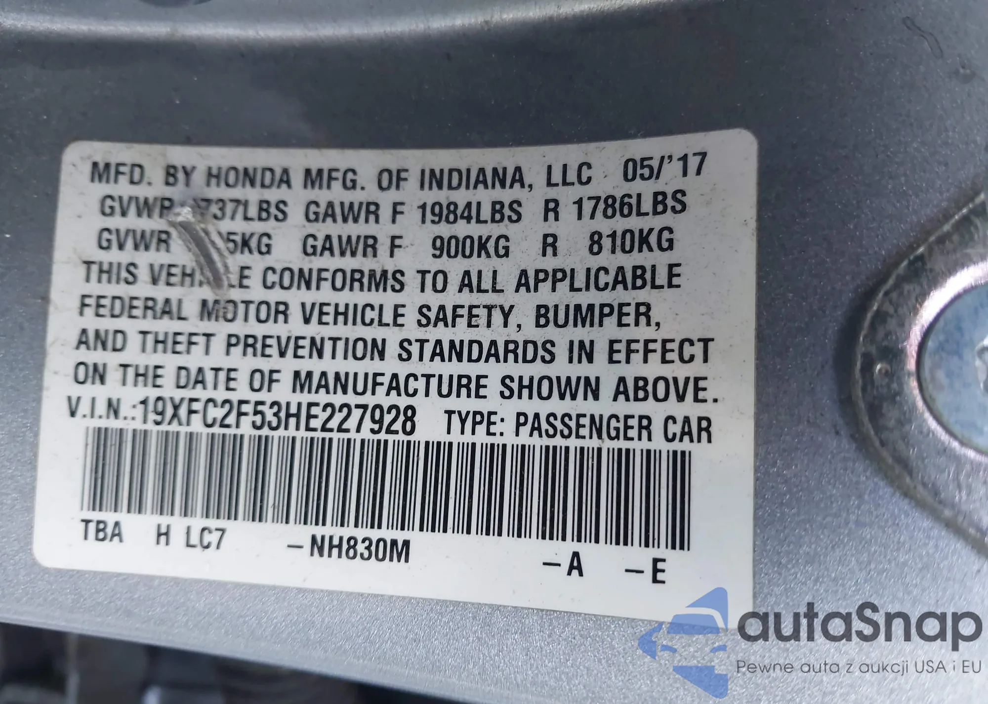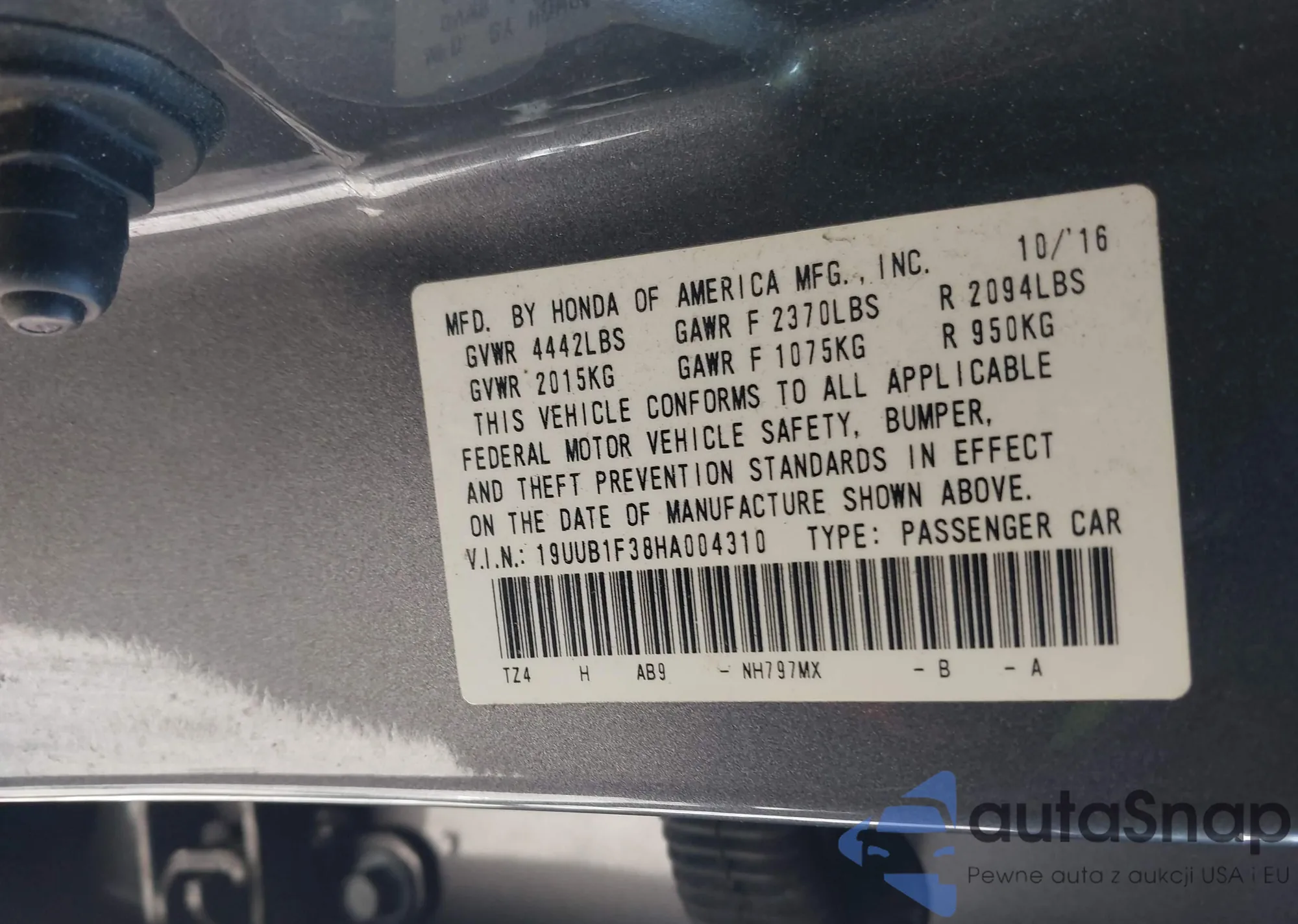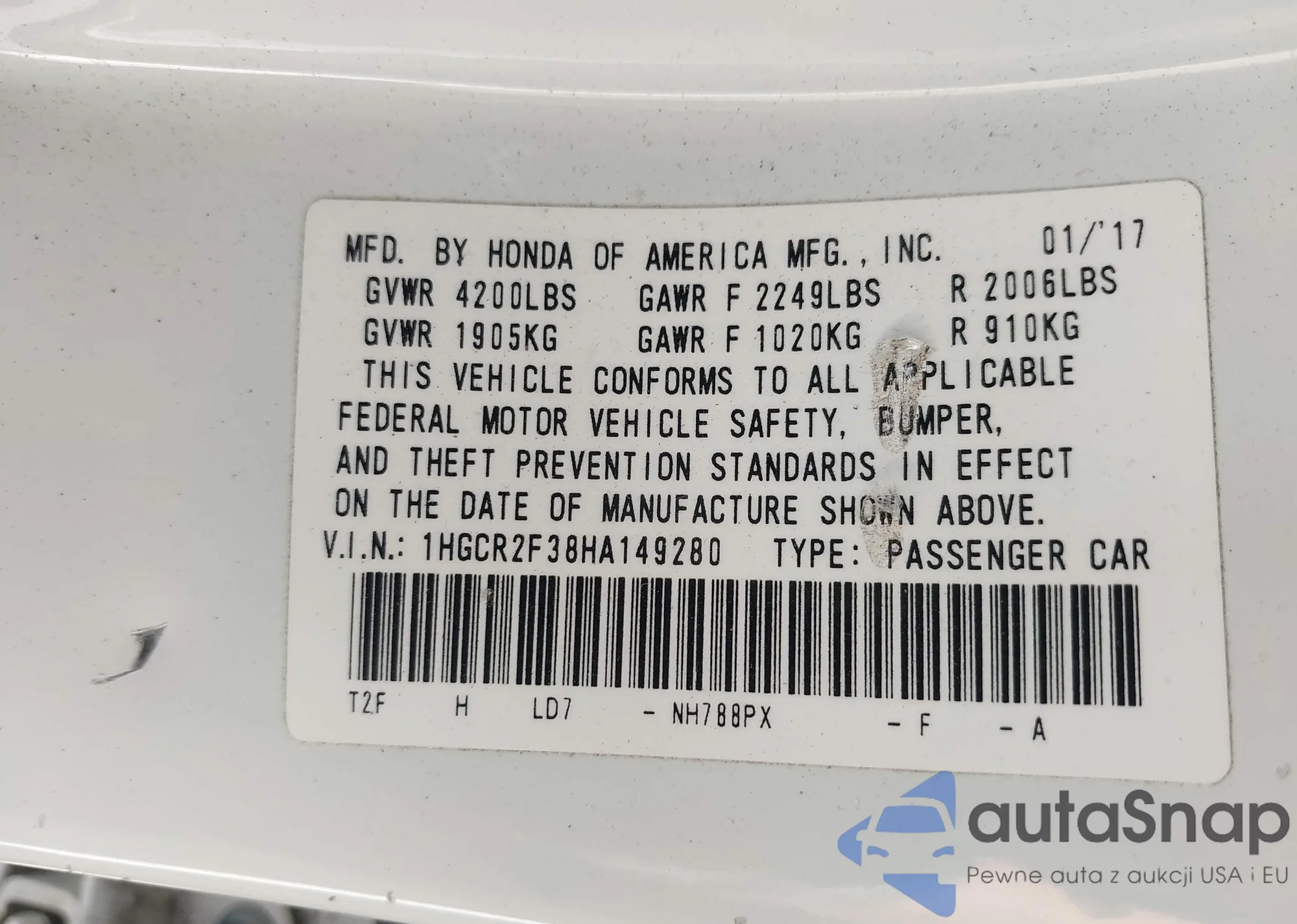 LOT: 42251511 VIN: 1HGCR2F38HA149280