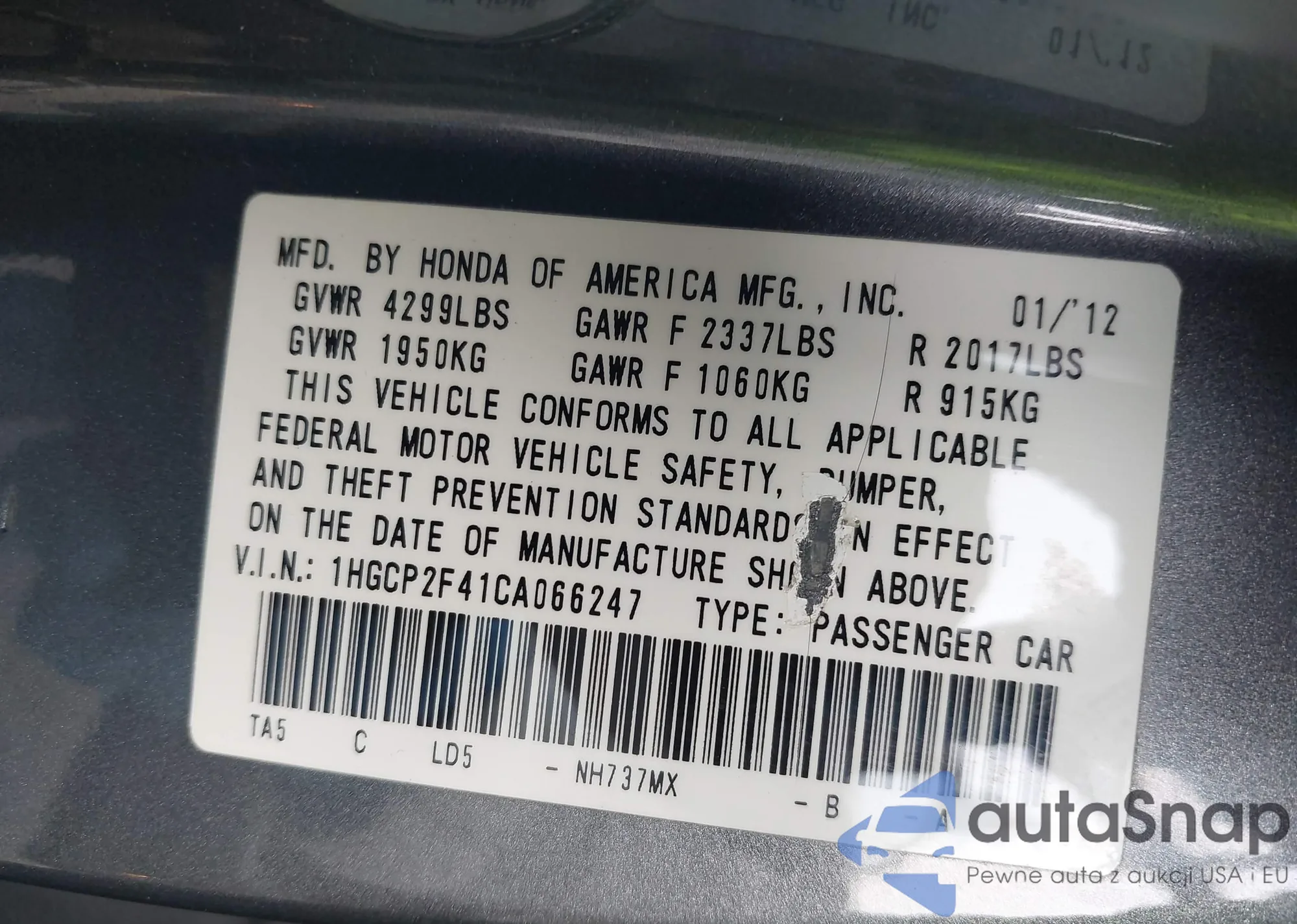 LOT: 41467802 VIN: 1HGCP2F41CA066247