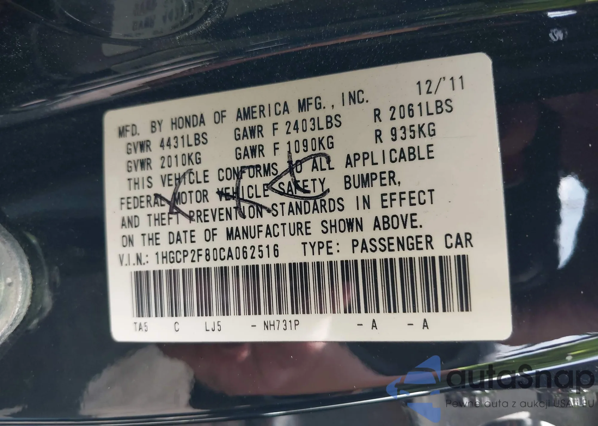 LOT: 42111000 VIN: 1HGCP2F80CA062516