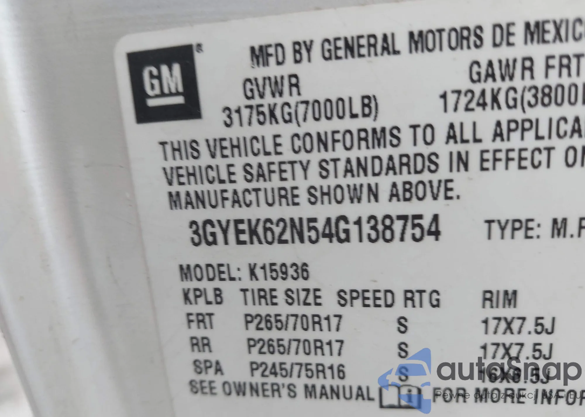 • VIN 3GYEK62N54G138754