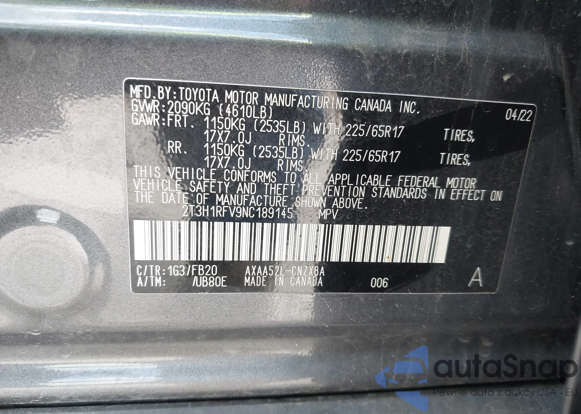 LOT: 42013663 VIN: 2T3H1RFV9NC189145