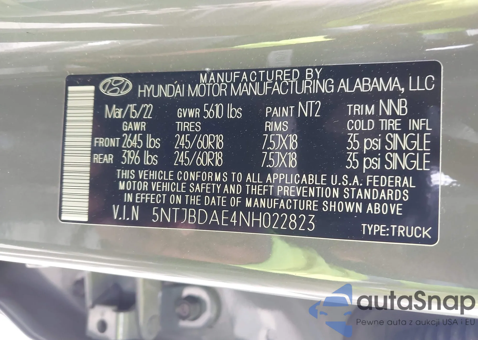 • VIN 5NTJBDAE4NH022823